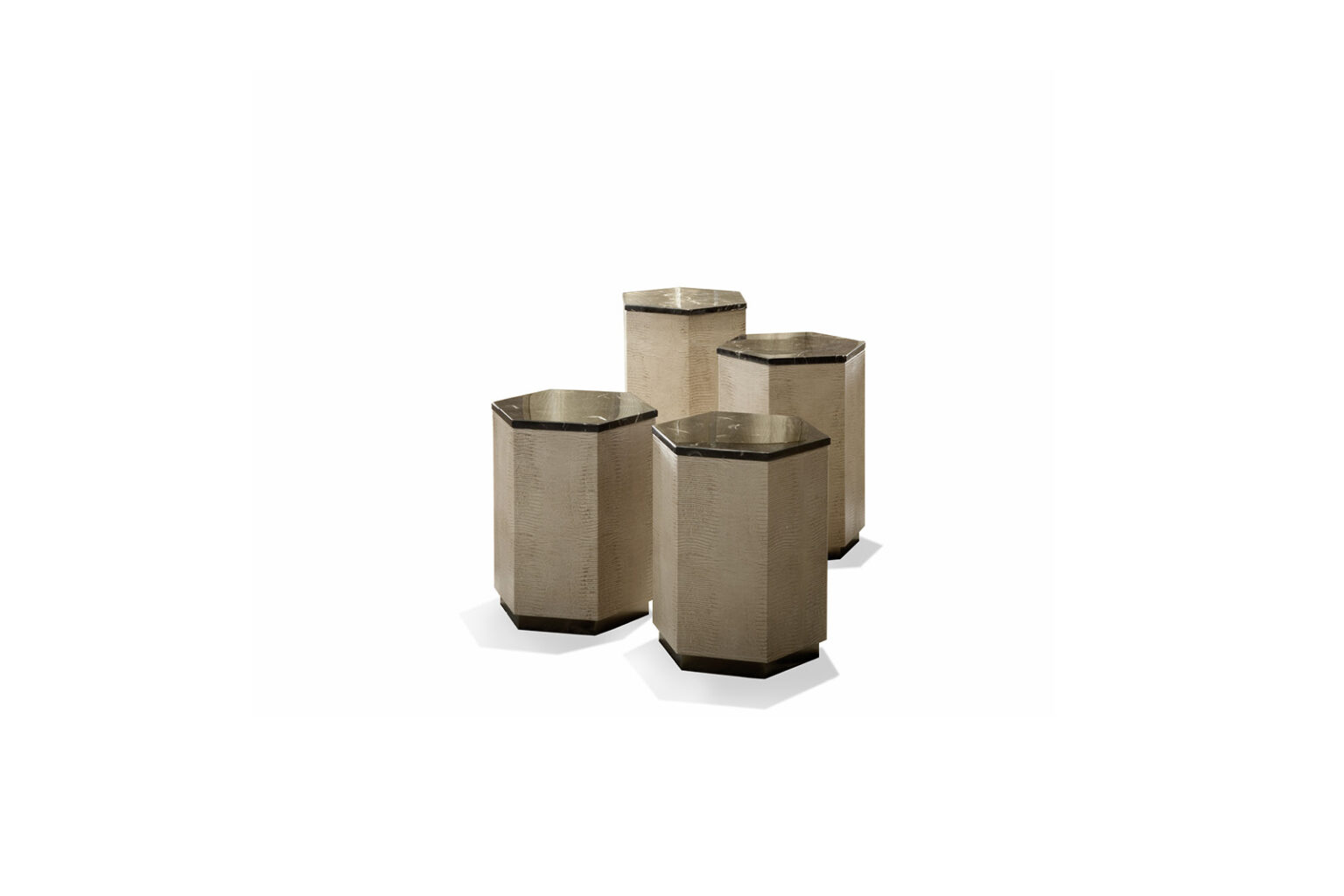 Octagonal table in armadillo printed leather with dark emperador marble top