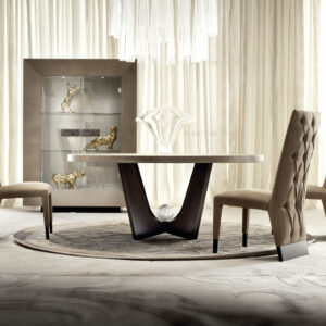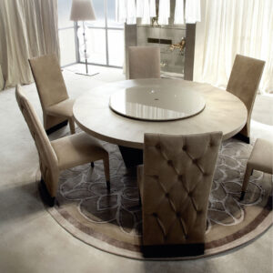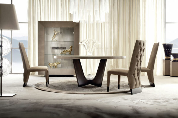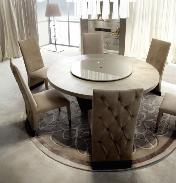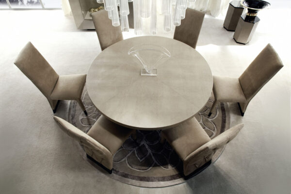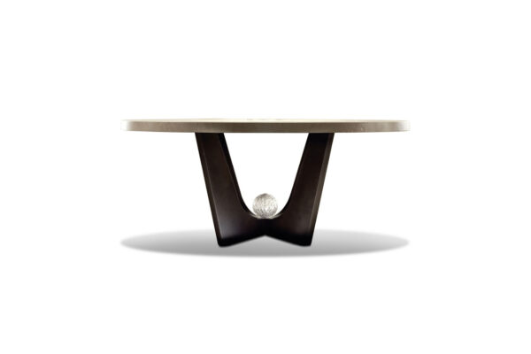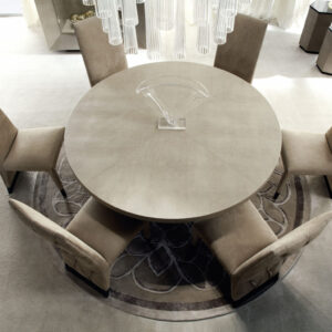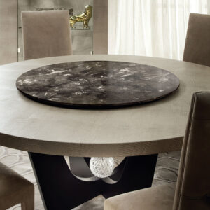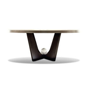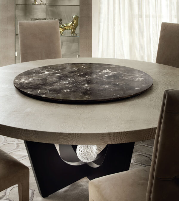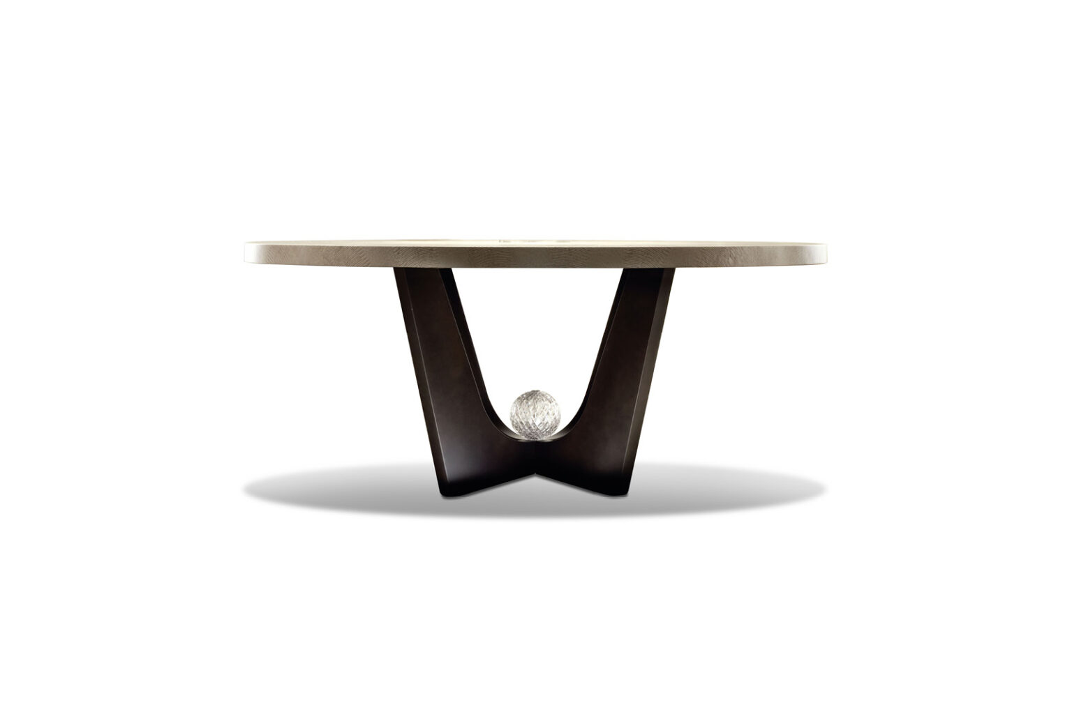 Round table in armadillo printed leather. Details in bronzed brass and base with insert “Murano” crystal ball.