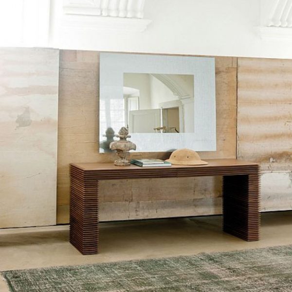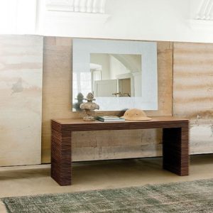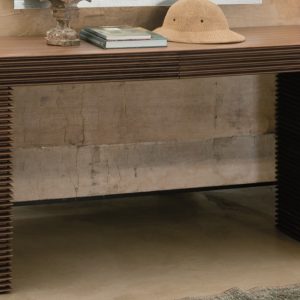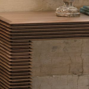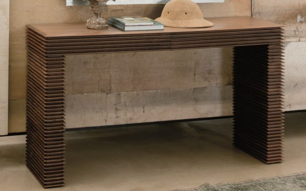 The Linka Console is a striking and elegant table featuring unique linear detailing carved into the wood finish, creating a distinctive layered effect. The table has two storage drawers and can be selected in a range of Canaletto Walnut finishes.