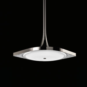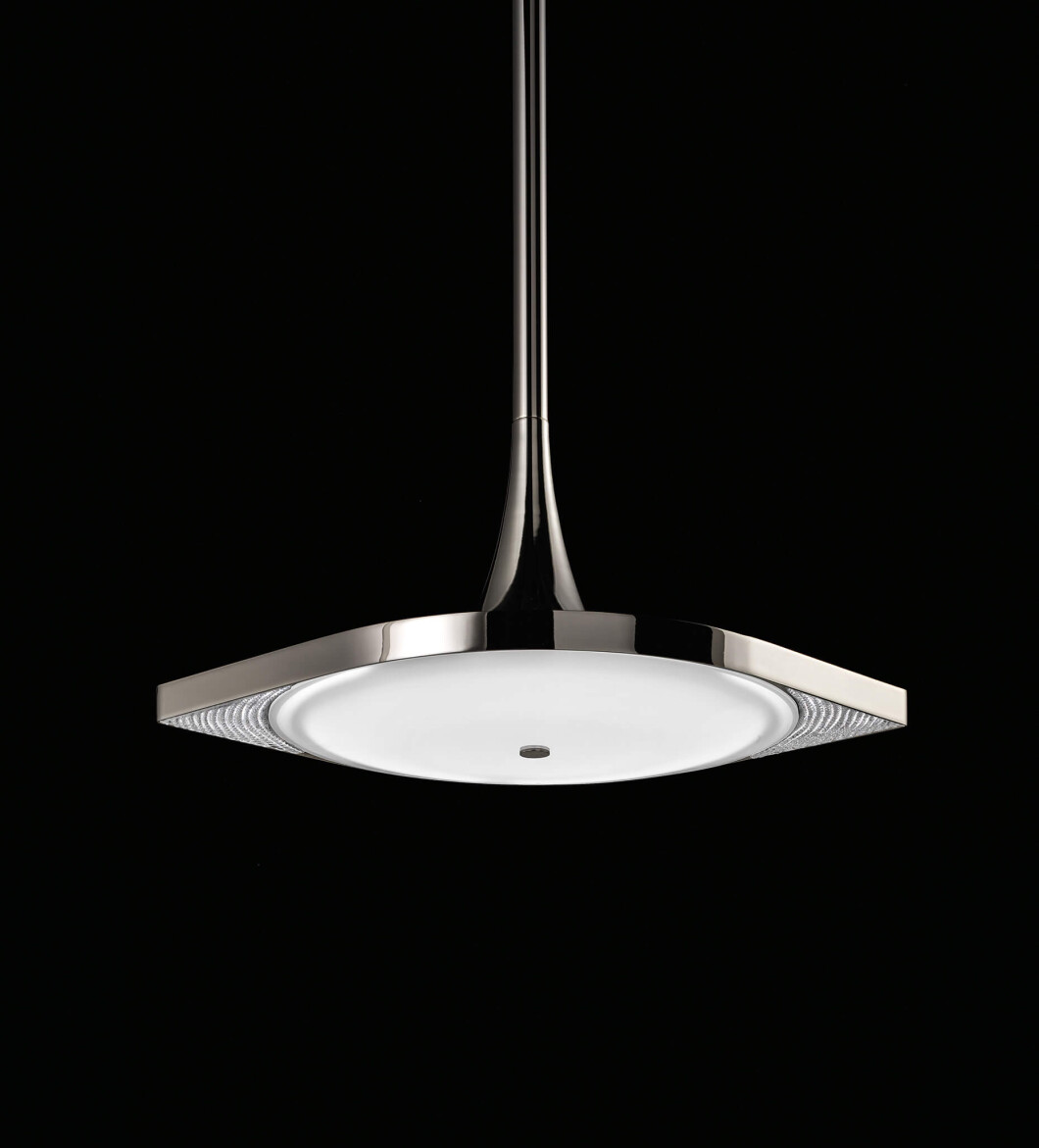Pendant in metal with clear gold finish and white opal diffuser with carved crystal accents. Available in different colours.