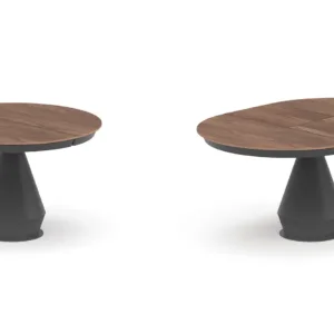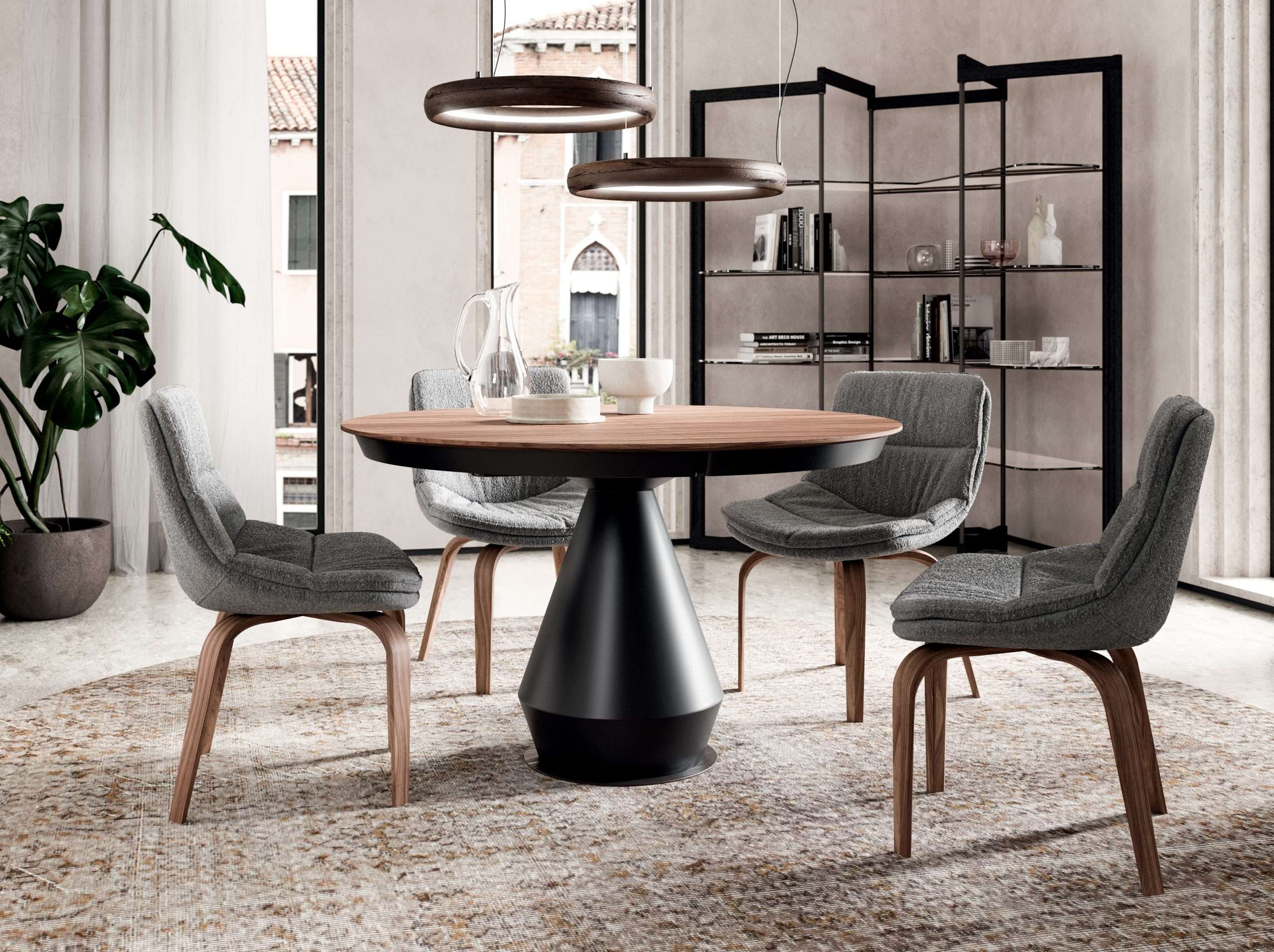 In the chessboard of your living room project, the Lycos concept evokes the shape of a bishop, dominating the scene with solid elegance. The top is round, ready to extend to new experiences. A table sculpted on your everyday needs, with tops and extensions available in multiple materials, all-wood too. For you and your guests, checkmate.