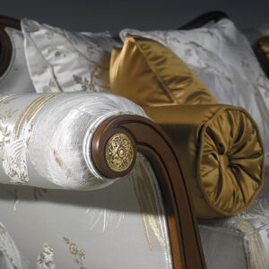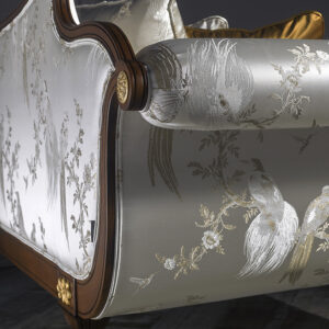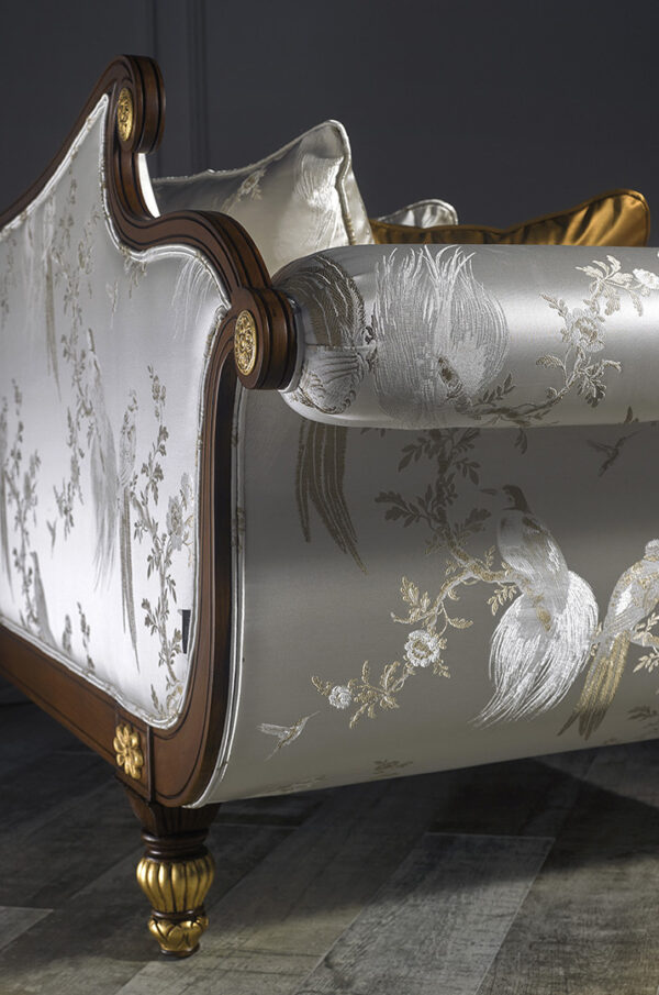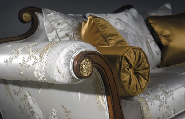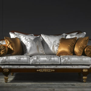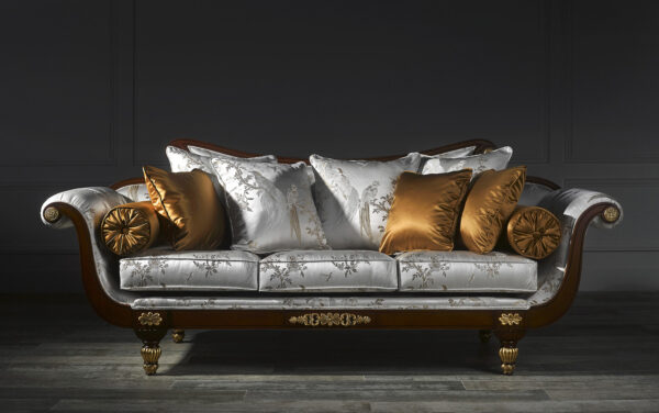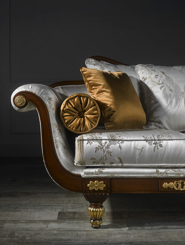 Maria Jose Guinot with her characteristic classical eye, has been inspired by the English Regency style while designing the Madona sofa. The carved scroll arms surround the sinuous sofa back which curves upward in the centre. With carved legs and delicate flower patterns.