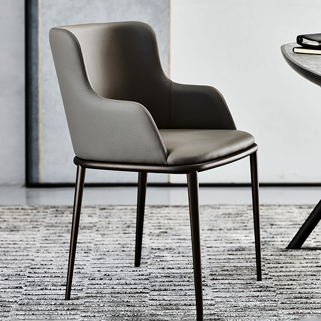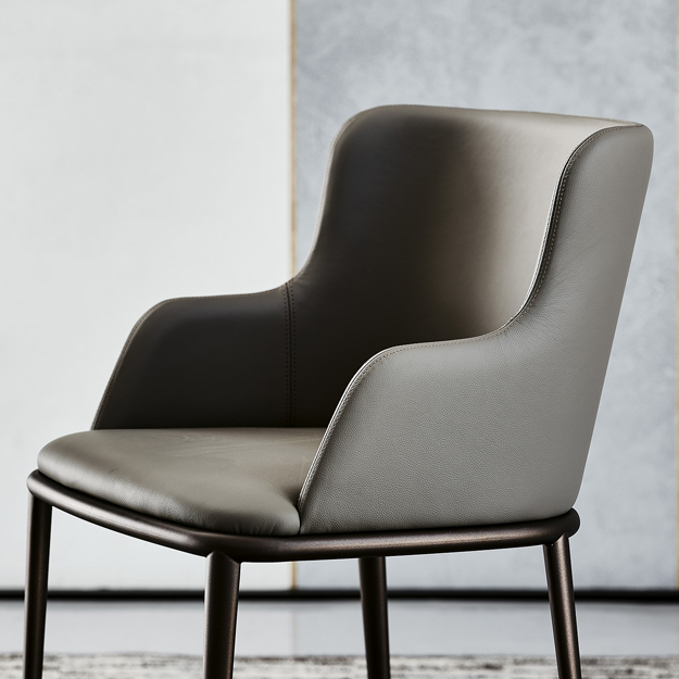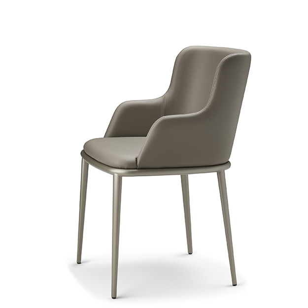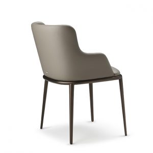 The Magda Chair With Arms is a stylish design featuring a cushioned seat and softly rounded backrest that gently curves round to meet the arms, supported by a lacquered metal frame with tapered legs. Available in a wide selection of synthetic or real leather finishes and colours.