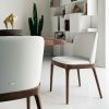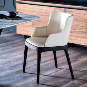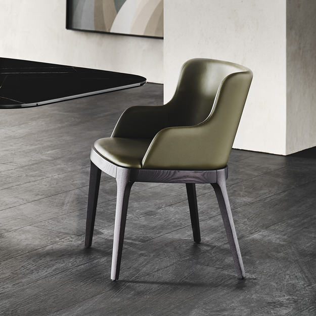 The Magda Wood Chair With Arms features a statement wood frame paired with a cushioned seat and elegantly rounded backrest and curved edges. The frame is available in a choice of finishes, while the chair is upholstered in a choice of synthetic or soft leathers.