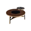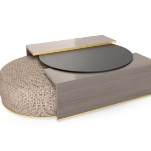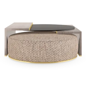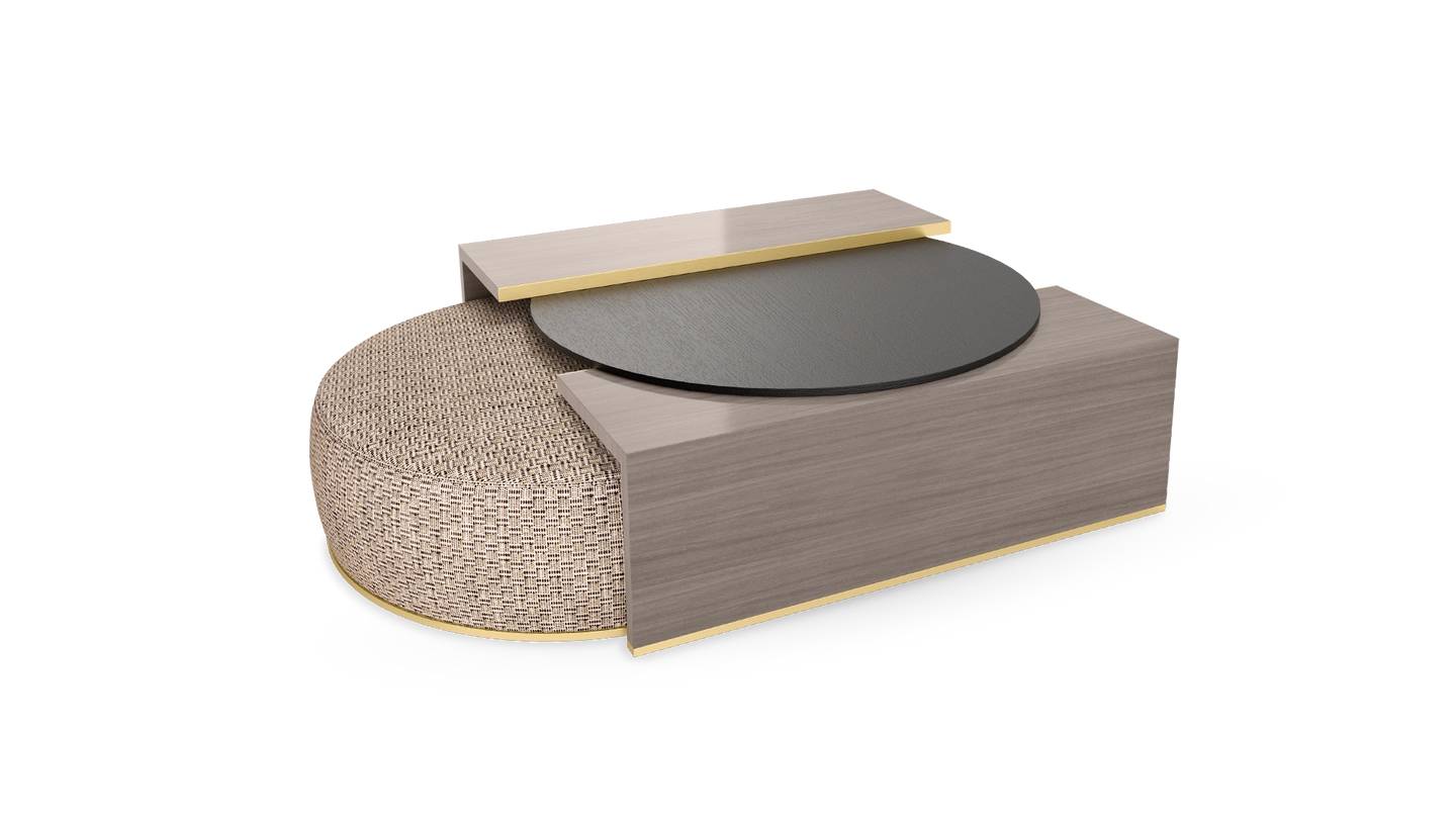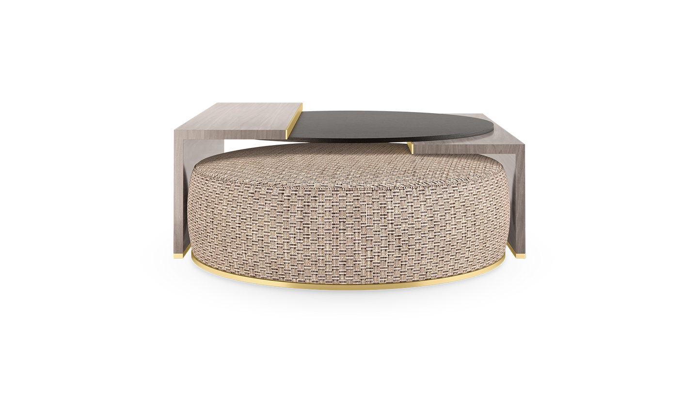 One of most fashion-forward pieces, the MAINE design offers two for one. The geometric coffee table, crafted from contrasting wood veneers with metallic trim, has a postmodern vibe, while an upholstered circular seat slots casually underneath.