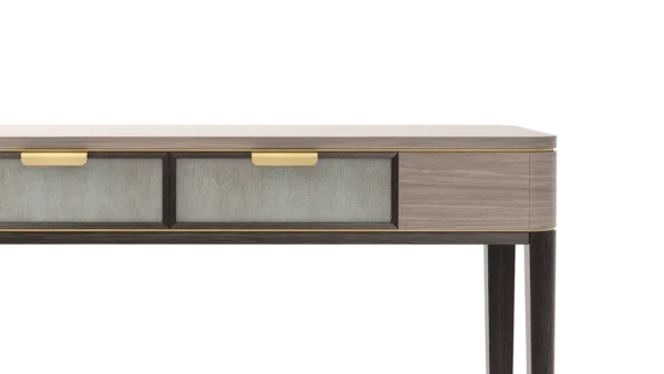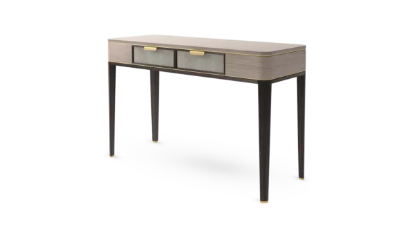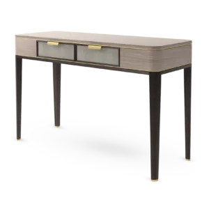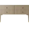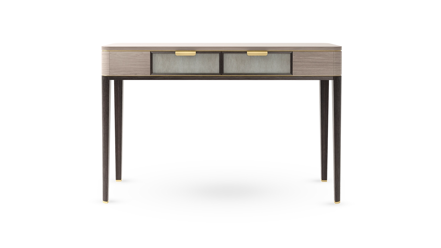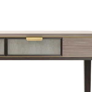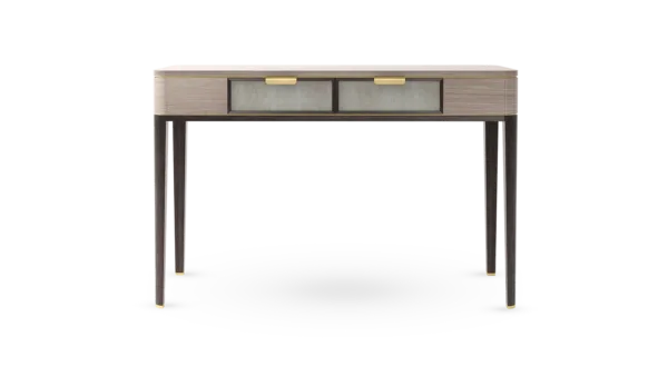 A contemporary dresser with timeless appeal, the MANDALAY employs a mix of materials in subtle and interesting ways. A blend of dark solid wood and beige-toned veneer highlighted with hints of brushed brass, the two drawers are inlaid with leather and internally lined with suede.