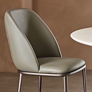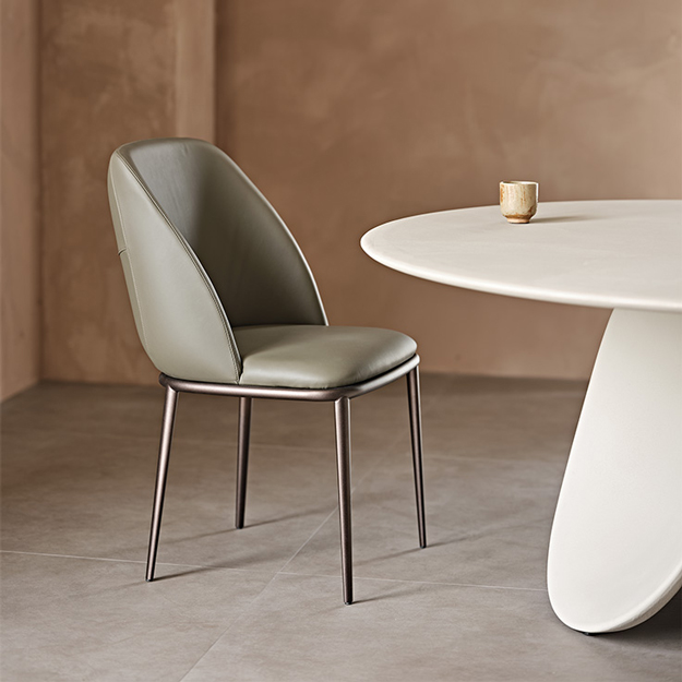 The backrest features subtle stitching and elegantly wraps around the occupier for a cocooning effect. The upholstered seat and metal frame are both available in a range of finishes for a bespoke look.