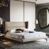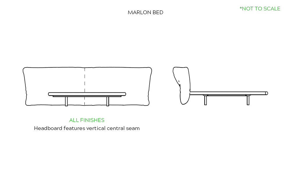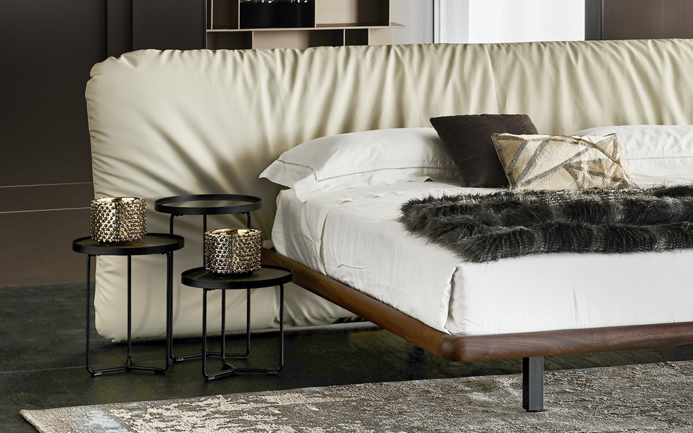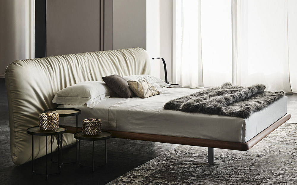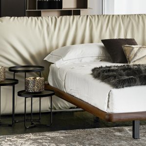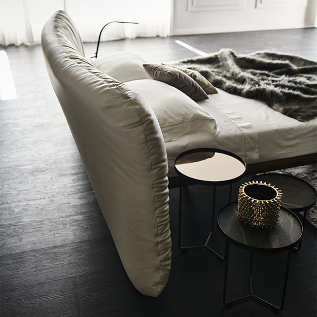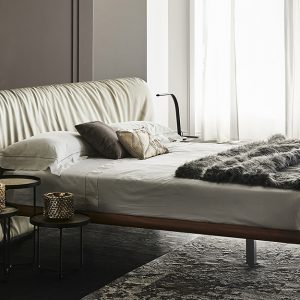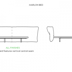 The contemporary Marlon Bed features a statement upholstered headboard with stylish ruched detailing. The headboard can be selected in a wide range of finishes from Cattelan Italia’s collection. This is complemented with a slatted wood frame and lacquered metal feet.