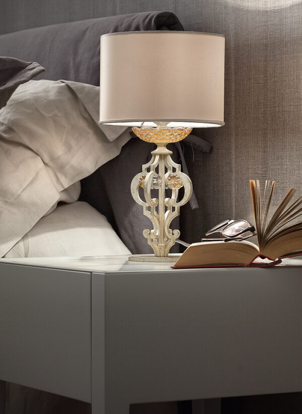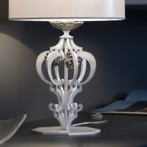 Metal frame with coloured glass inserts and pendants. Satin lampshades