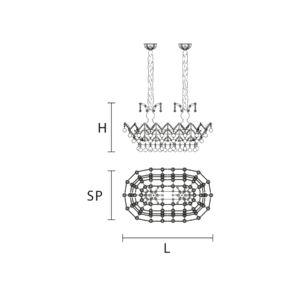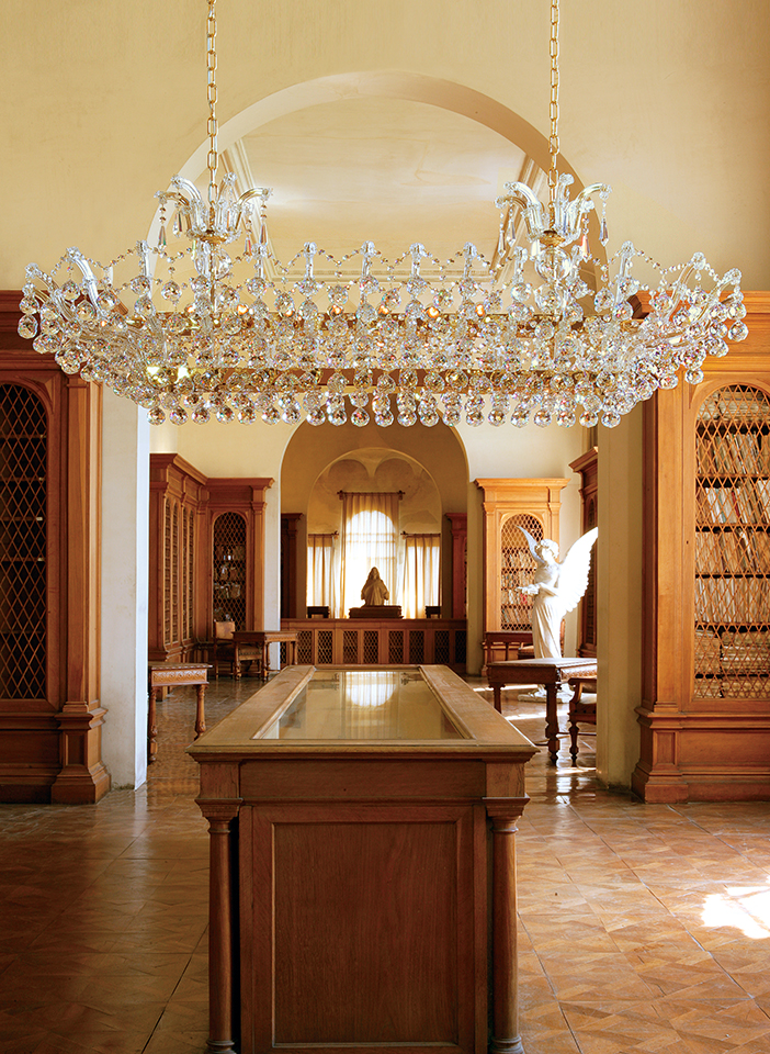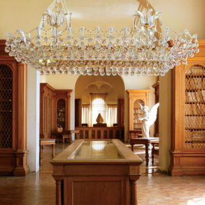 Maria Teresa is a collection of iconic Venetian chandeliers, with glass-covered arms, volutes and hanging arrays of pendants.