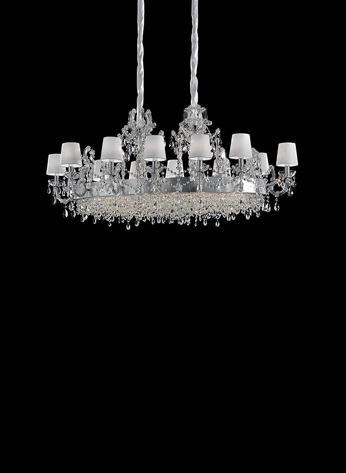 Maria Teresa is a collection of iconic Venetian chandeliers, with glass-covered arms, volutes and hanging arrays of pendants.