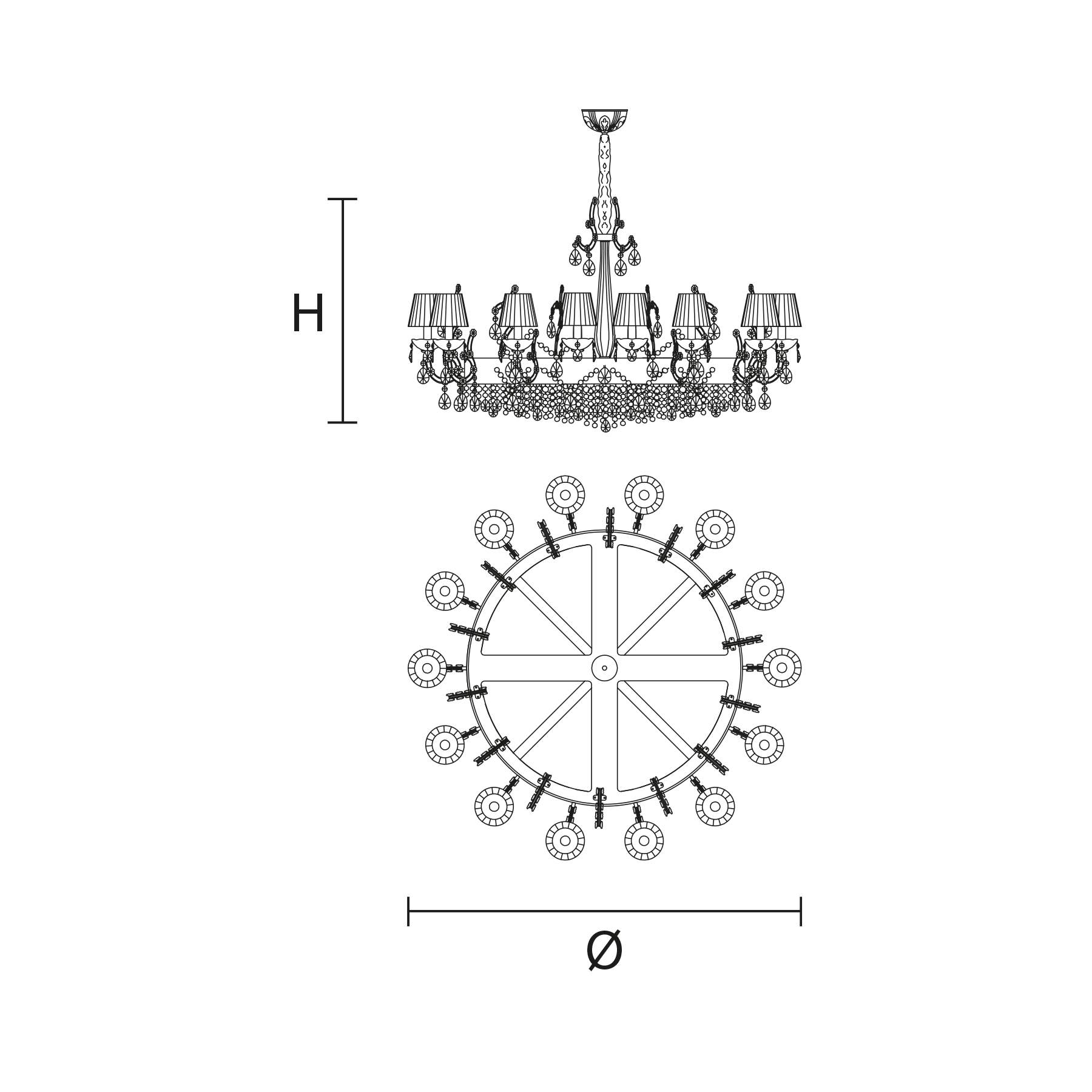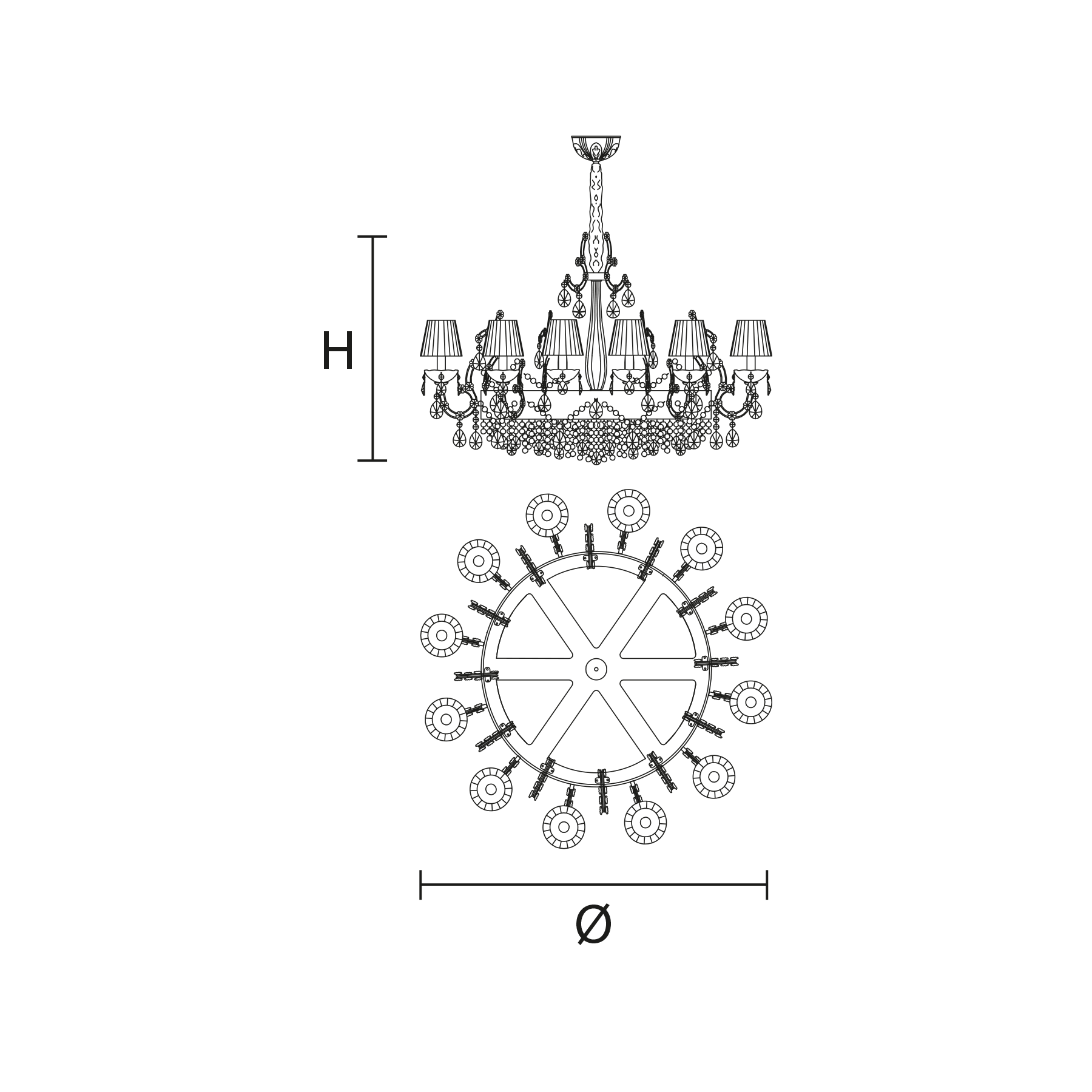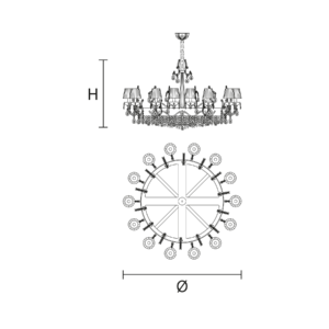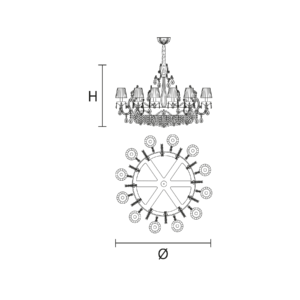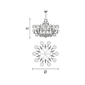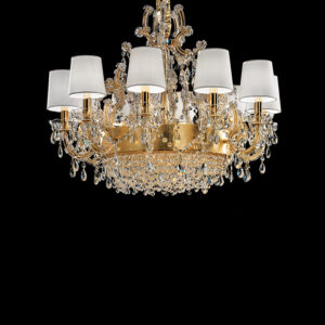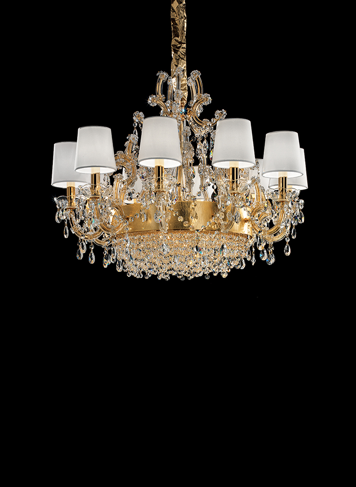 Maria Teresa is a collection of iconic Venetian chandeliers, with glass-covered arms, volutes and hanging arrays of pendants.