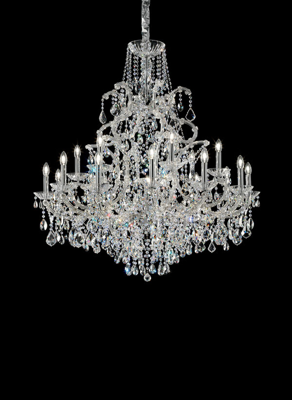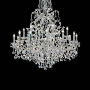 Maria Teresa is a collection of iconic Venetian chandeliers, with glass-covered arms, volutes and hanging arrays of pendants.