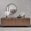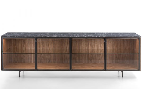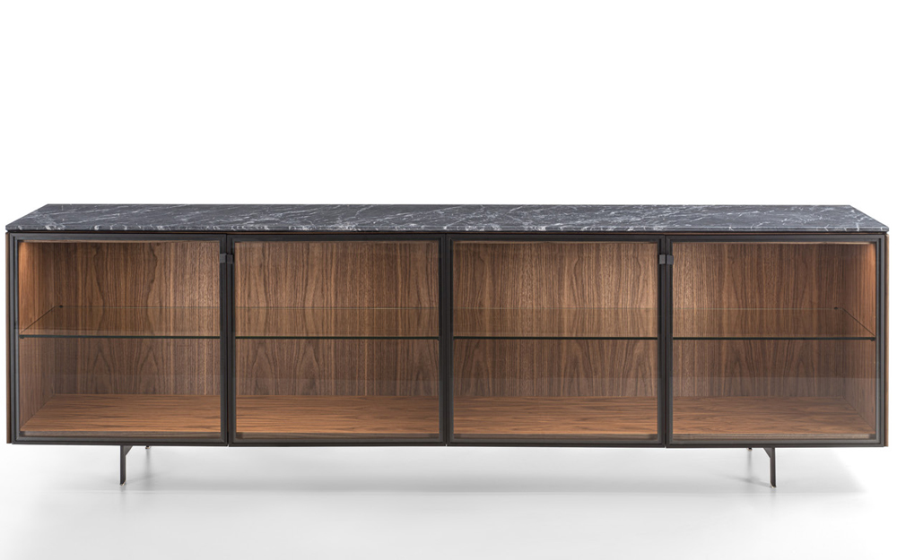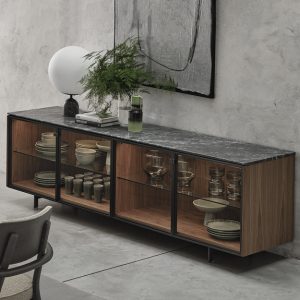 The graceful Matics Glass Sideboard by Porada features a solid canaletto walnut frame with four reflective coated glass front door panels edged in sleek grey pewter metal with subtle metal handles, glass internal shelves and internal dimmable lighting that can be operated via remote control or an app.