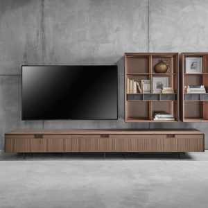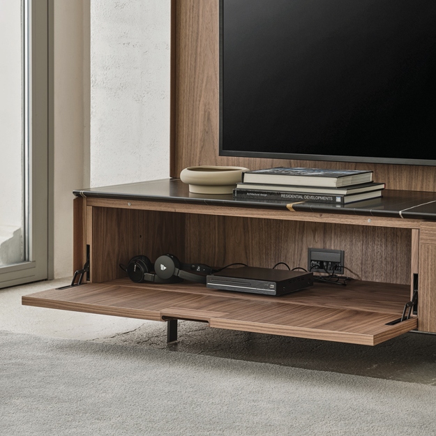 The Matics TV Unit by Porada is an elegant low media unit available in a choice of widths, in solid canaletto walnut with cutaway handles located at the top of each drop-down door. The door fronts feature a stylised mix of horizontal and vertical wood grain for added detail.