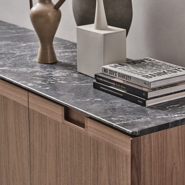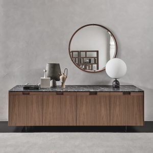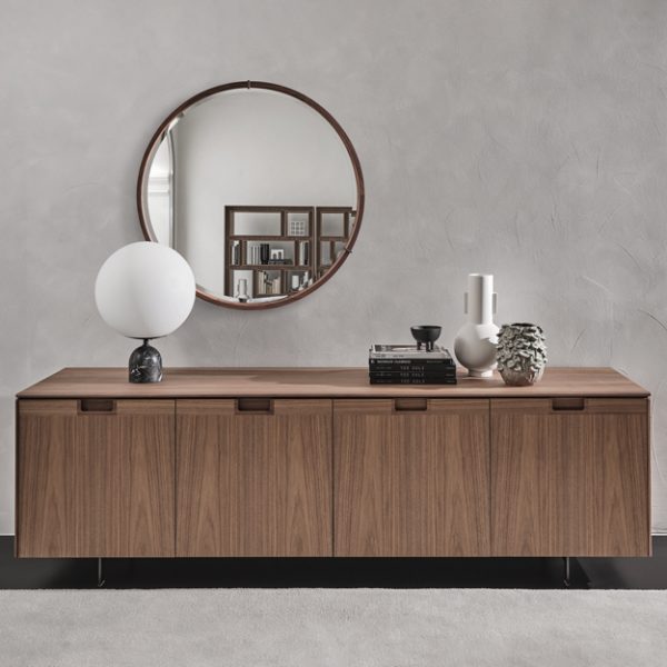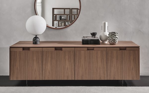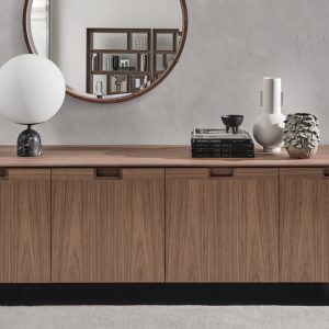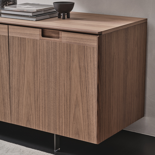 The Matics Wood Sideboard is an understated  design in canaletto walnut featuring four hinged cupboards with a recessed handle located at the top centre of each door. The door fronts feature a stylised mix of horizontal and vertical wood grain for added interest.