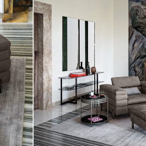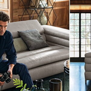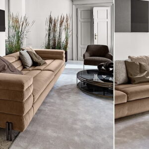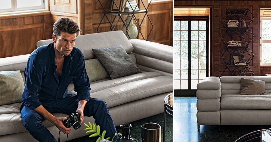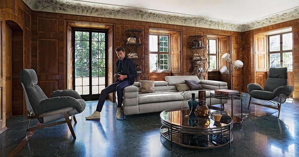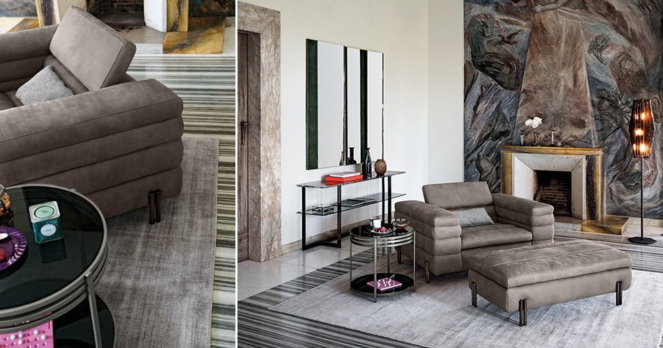 A movement of the backrest provides superior comfort, and yet when in it is in standard position, it showcases the thought-out unilateral design and exceptional stitching in each cushioned element. The seating, the backrest and the armrests demonstrate unique styling, playing with unilateral cushioned effect throughout; the legs again are an uncommon vertical design that plays to the Arketipo way.