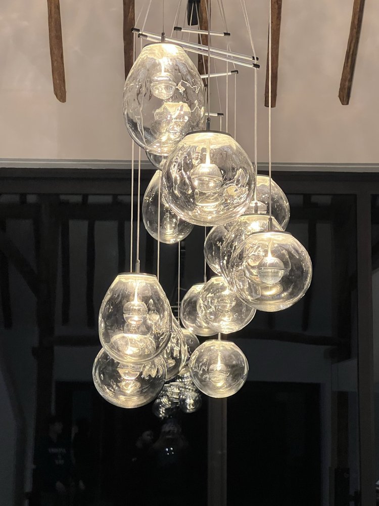 Each glass has our Meso light ball to its centre, with its dual light elements to both fill the shade with light whilst perfectly lighting below with glare free warm white light.