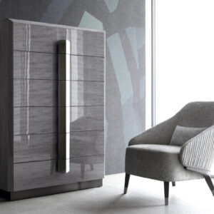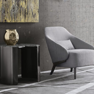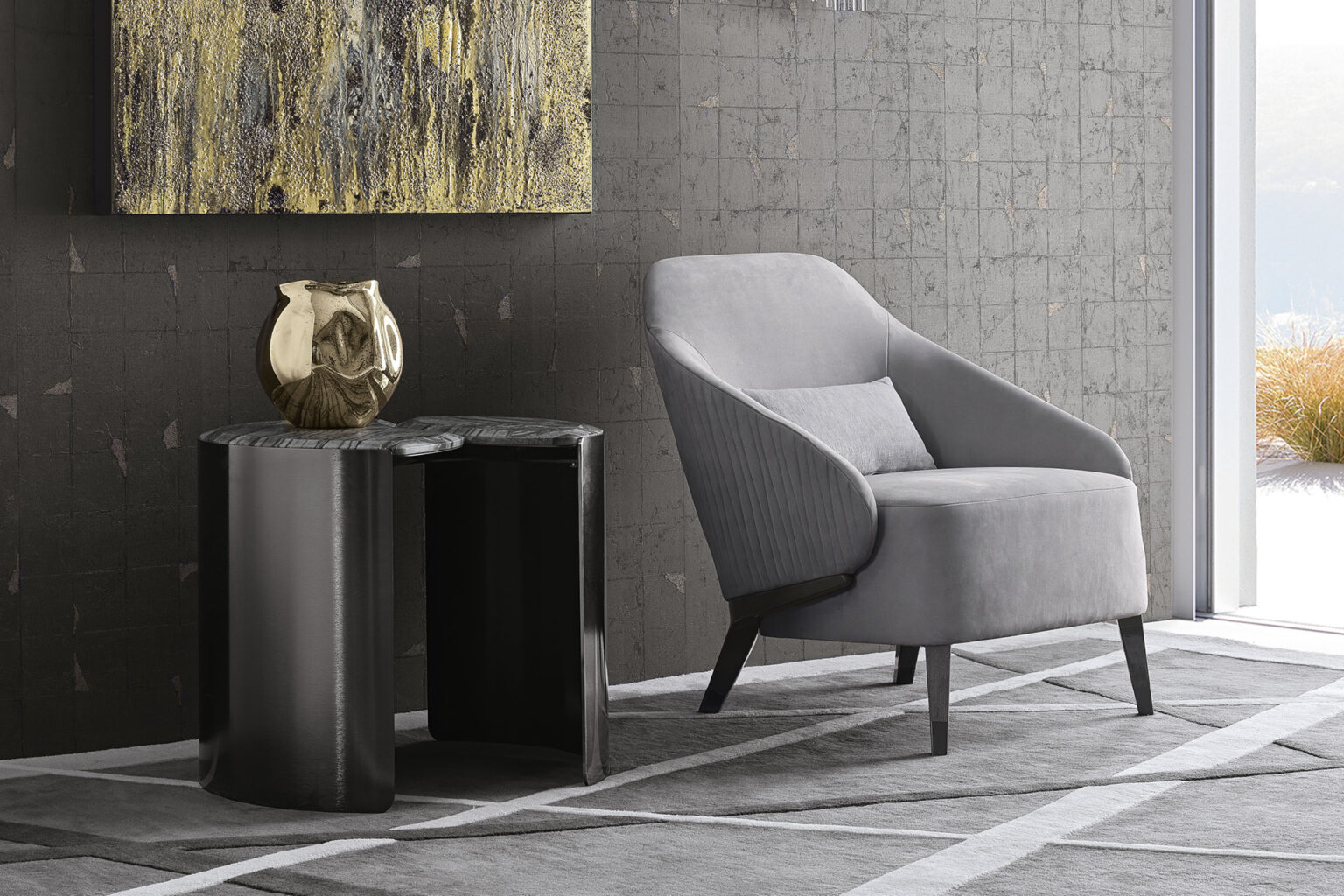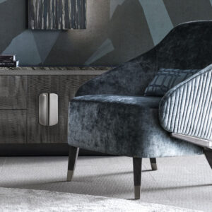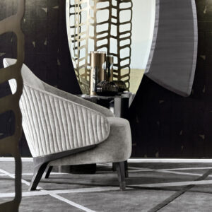 Occasional chair available in first grade leather, nubuk leather, lizard printed leather, velvet or suede fabric. Chair seat and sides with double stitching in polyurethane foam wrapped in down feather. Back in quilted fìnish. Wooden base with Giorgio Collection logo. 4 legs with details in satin black nickel stainless steel.