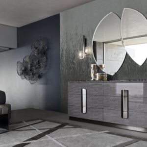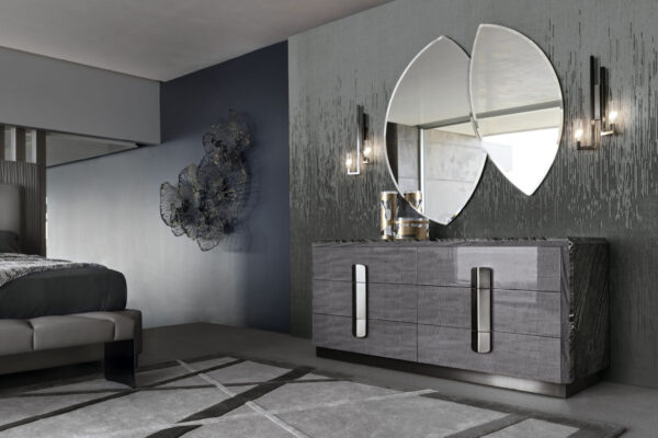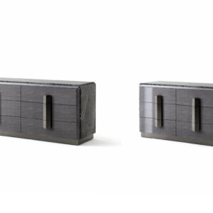 Dresser in Madagascar figured Mowinghi veneer in high gloss polyester finish. Top and sides in Kenya Black marble. Base and handles in satin black nickel stainless steel. 6 full extension drawers with bottom part in velvet fabric.