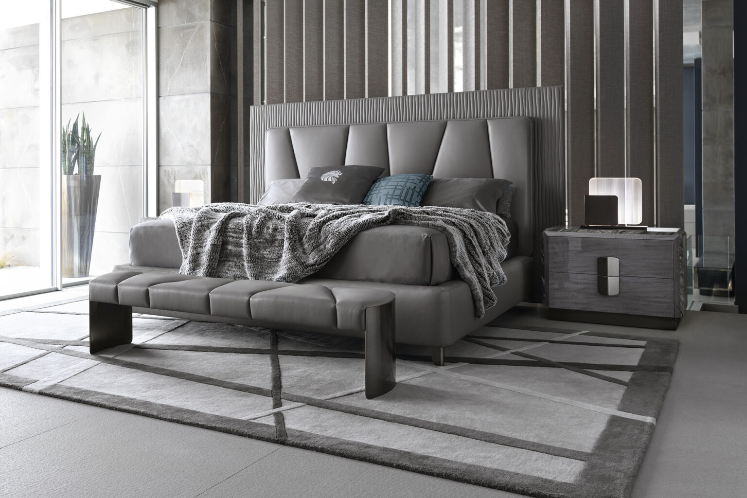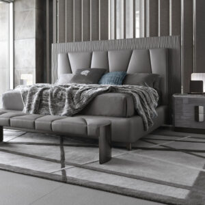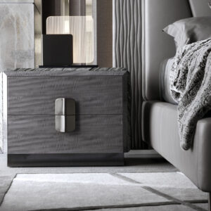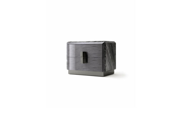 Night table in Madagascar figured Mowinghi veneer in high gloss polyesterfinish. Top and sides in Kenya Black marble. Base and handles in satin black nickel stainless steel. 2 full extension drawers with bottom part in velvet fabric.