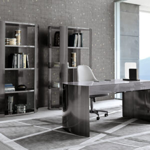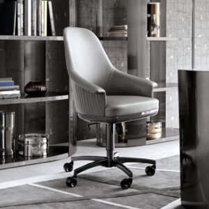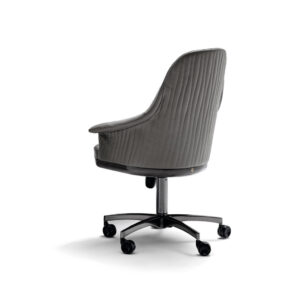 Fully upholstered home office chair in solid beech on wheels with adjustable seat height (cm. 44/52). Back in quilted first grade leather, nubuk leather, lizard printed leather, velvet or suede fabric. Wooden frame seat with Giorgio Collection logo. Base in satin black nickel stainless steel.