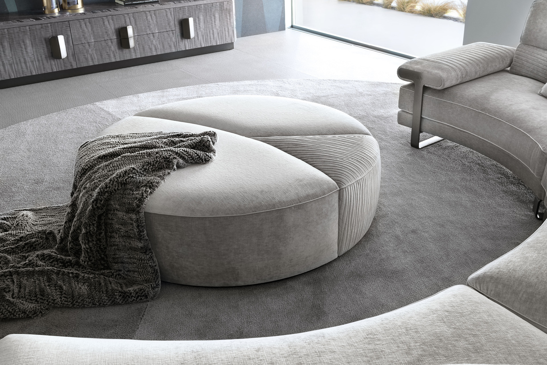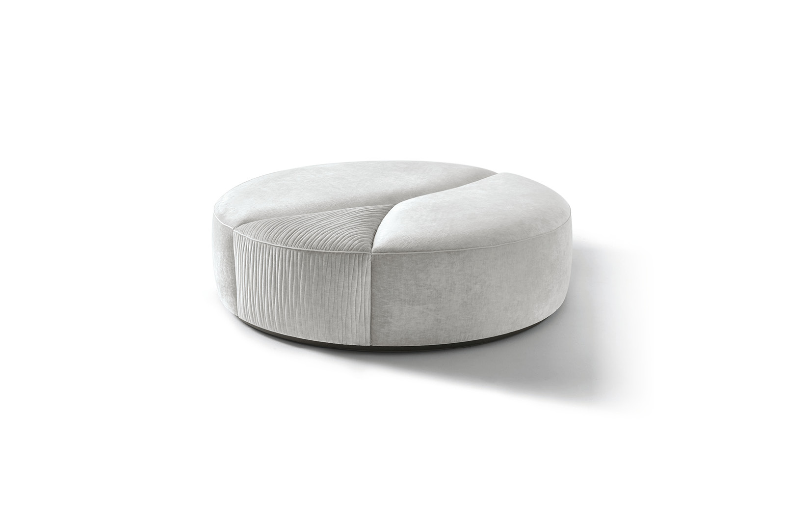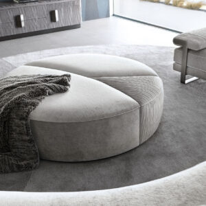 Round ottoman available in first grade leather, nubuk leather, lizard printed leather, velvet or suede fabric. Seat in special stitching in polyurethane foam wrapped in down feather. Center part realized in quilted finish. Base in satin black nickel stainless steel.