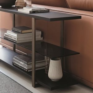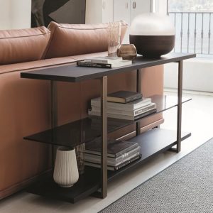 The Modus is a multi-functional piece that can be used as a console table and a bookshelf. The Modus features two solid ash wood shelves, a central smoked glass shelf and a brushed bronzed brass metal frame and base.