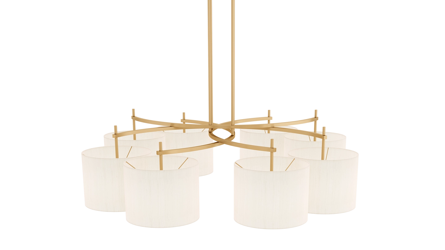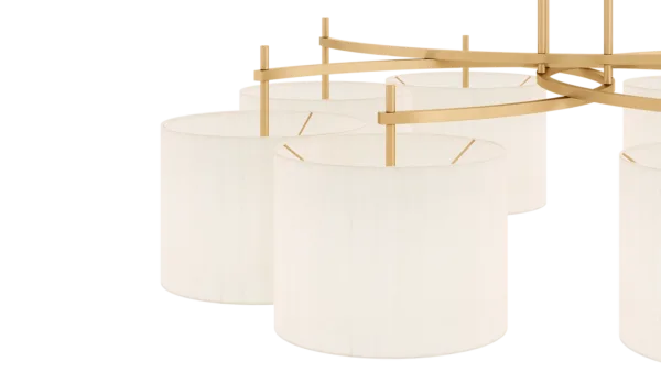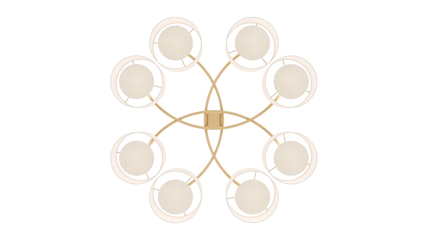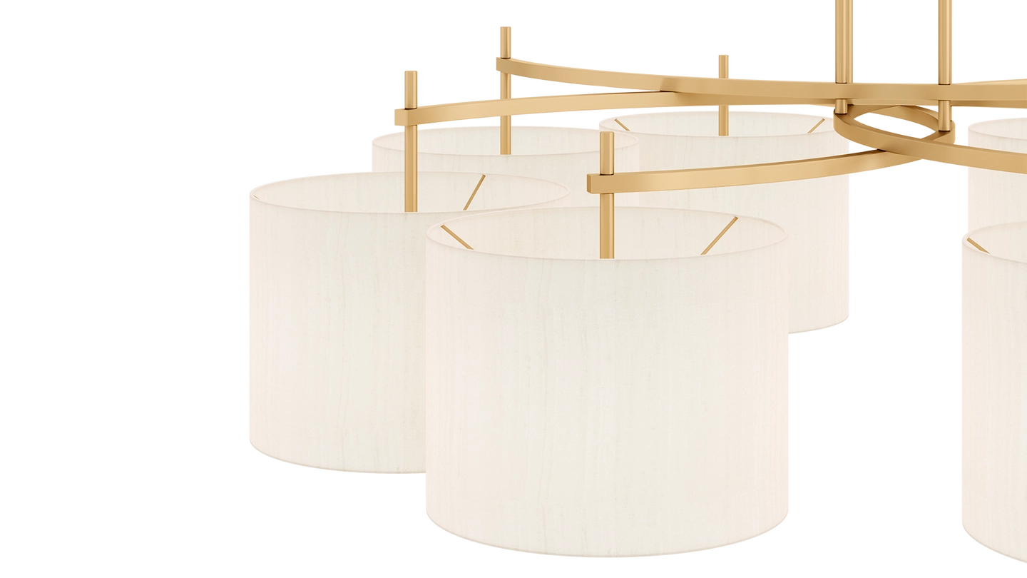 Emanating outwards from a brushed-brass structure, the eight cylindrical silk shades of the MONTPELLIER ceiling lamp incorporate a diffuser to soften their luminosity.