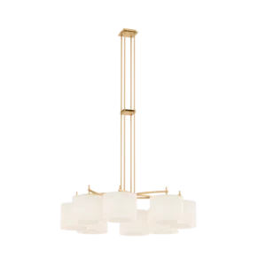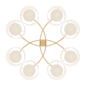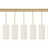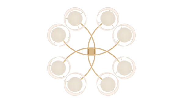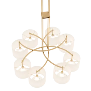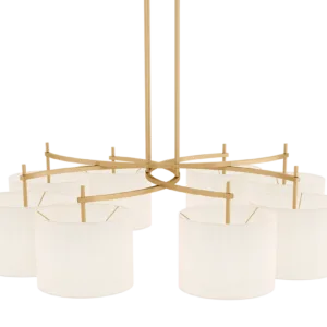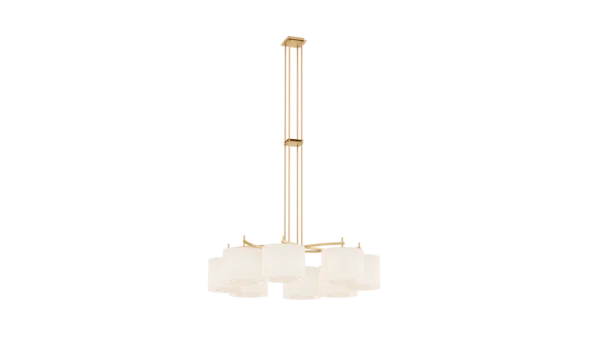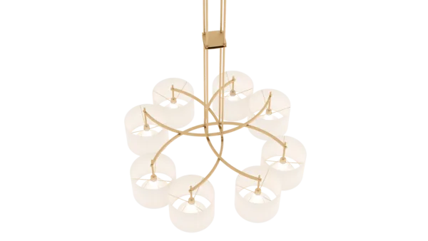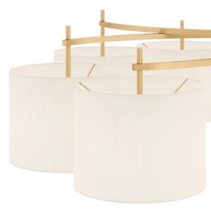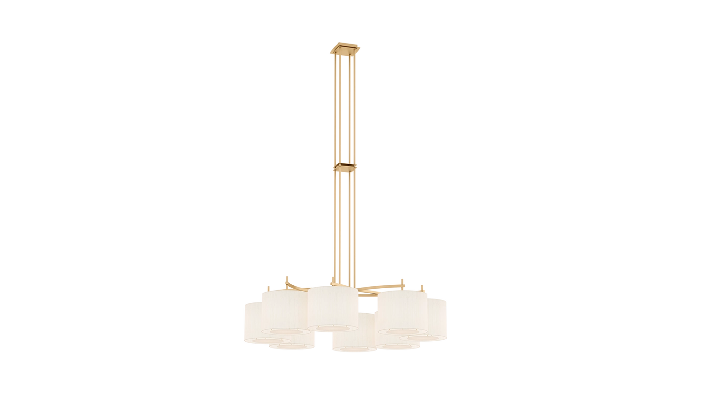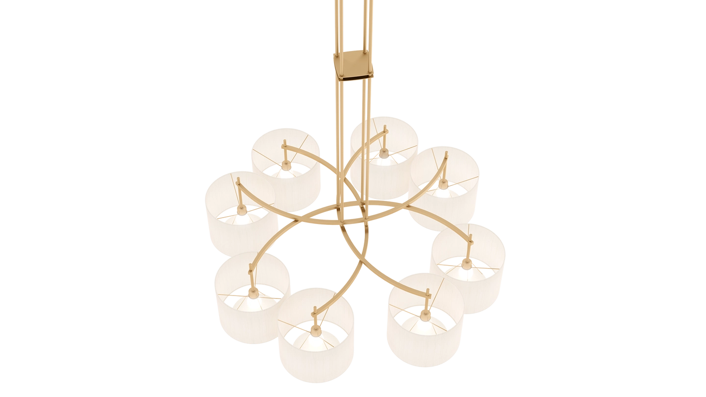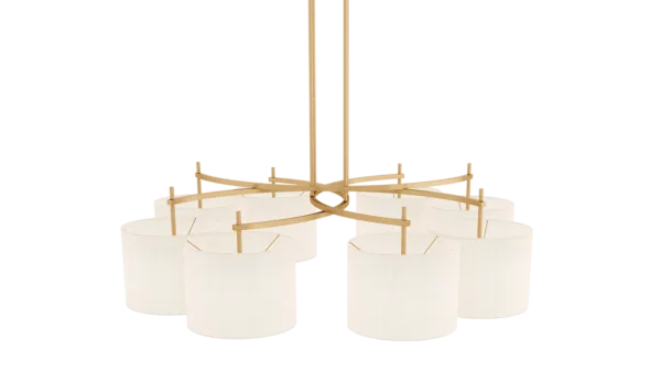 Emanating outwards from a brushed-brass structure, the eight cylindrical silk shades of the MONTPELLIER ceiling lamp incorporate a diffuser to soften their luminosity.