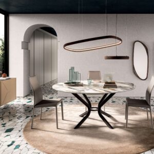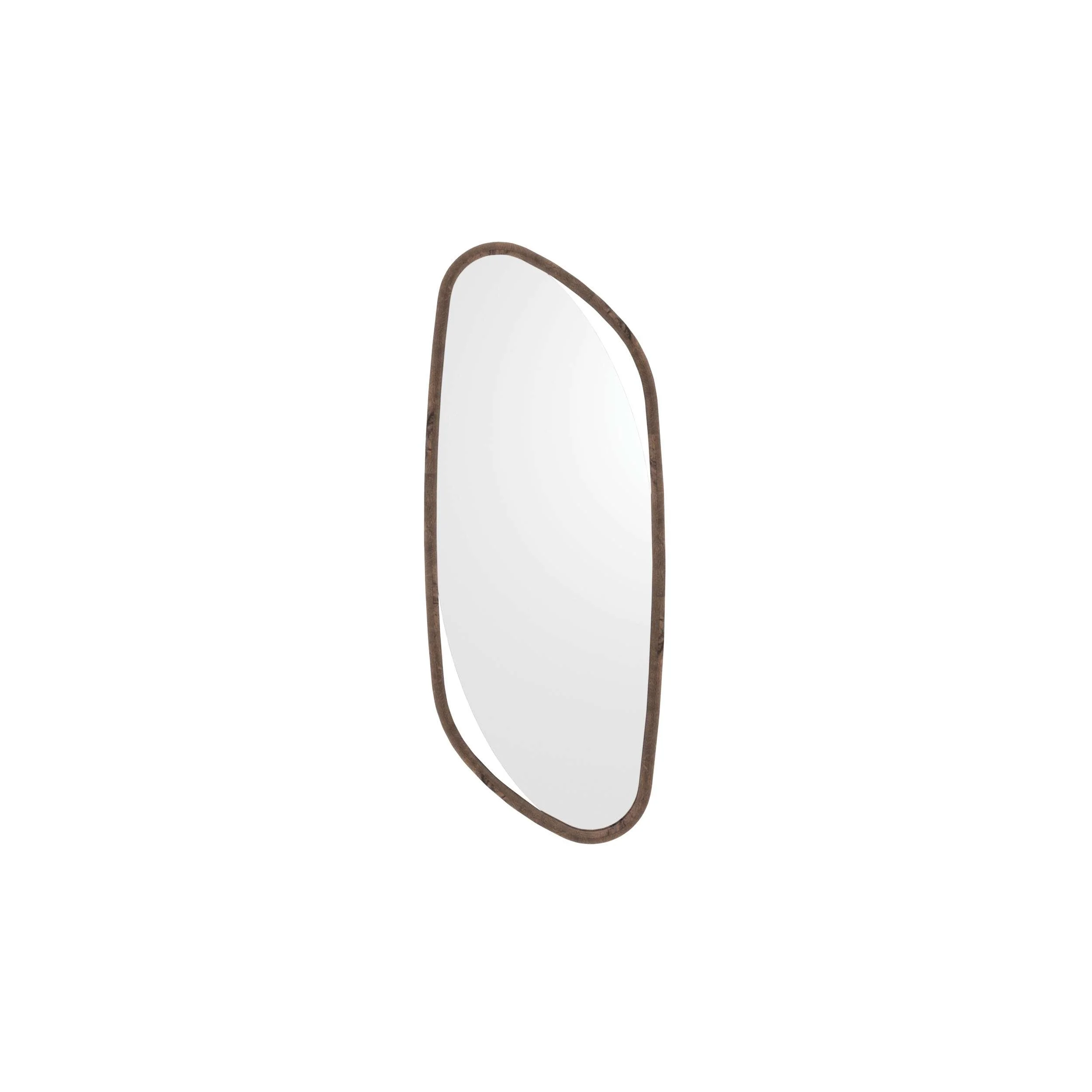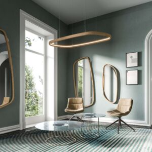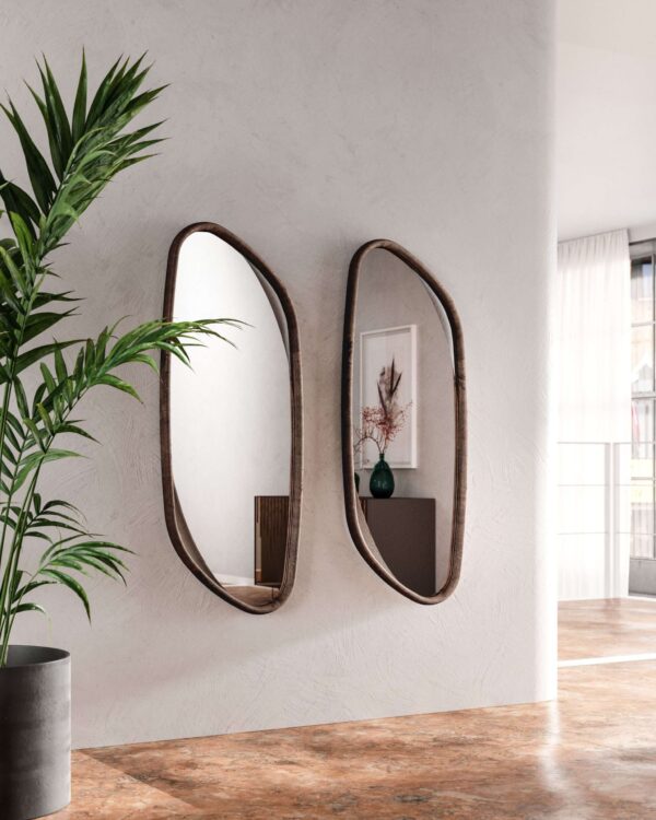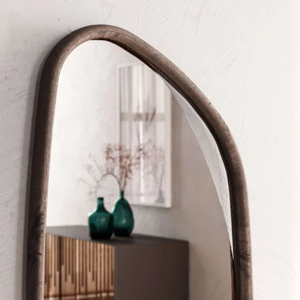 An oval-shaped mirror that rests on a domestic wall with a slight inclination. The precious wooden frame granted itself a whim, emerging from it to assert its presence and expanding towards the edges. A light composition, with contemporary charm capable of bestowing us with a sense of grace.