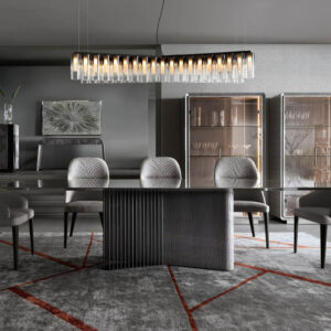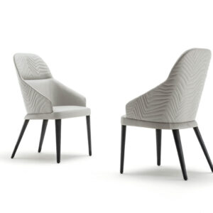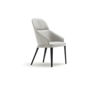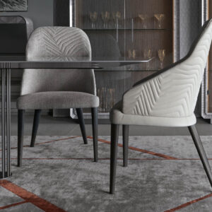 Fully upholstered armchair in solid oak. Back in quilted first grade leather, nubuk leather, lizard printed leather, velvet or suede fabric. Upholstered base with embroidered Giorgio Collection logo. 4 legs in satin open grain oak.