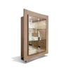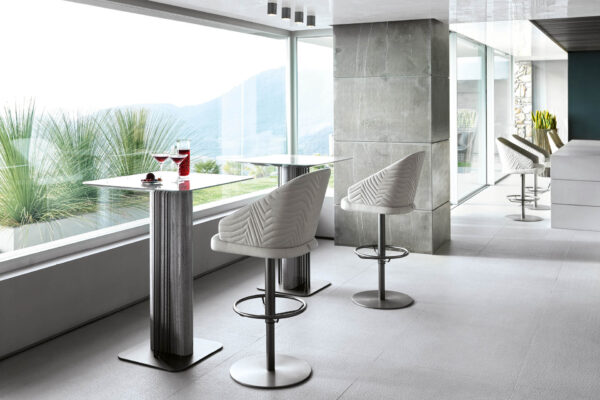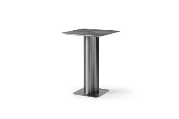 Bar table with top in inlaid Tasmanian curly Eucaliptus veneer with high gloss polyester finish. Base in combination of satin grey nickel stainless steel and Tasmanian curly Eucaliptus veneer with high gloss polyester finish.