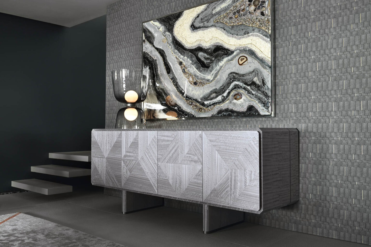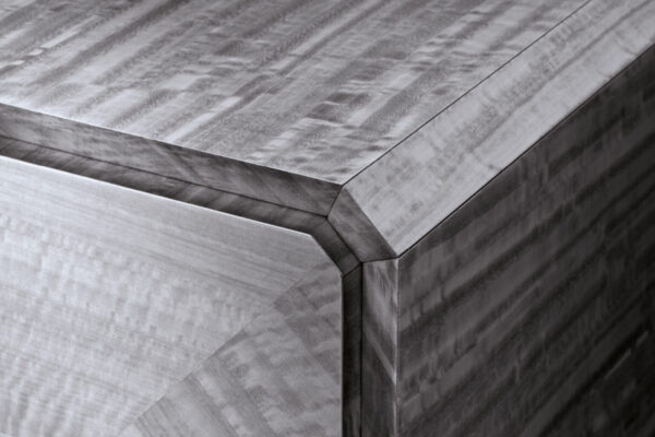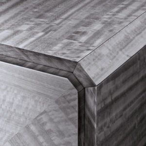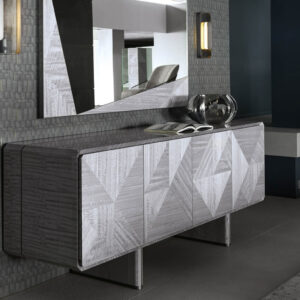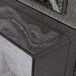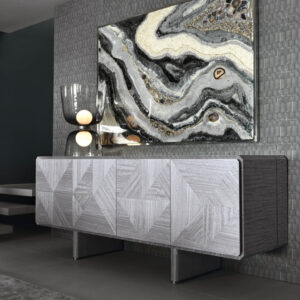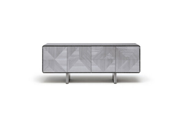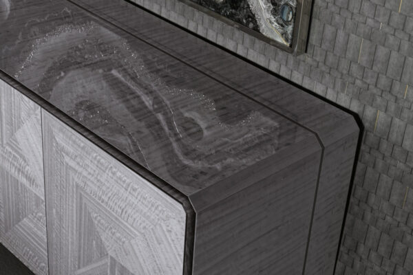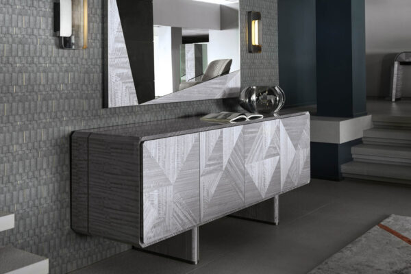 Buffet in inlaid Tasmanian curly Eucaliptus veneer with high gloss polyester finish. Top, sides and legs with insert in satin grey nickel stainless steel. 1 interior full extension drawer with front in Tasmanian curly Eucaliptus veneer with high gloss polyester finish, bottom part in velvet fabric. 3 adjustable tempered glass shelves.