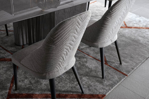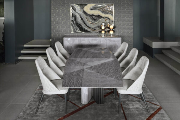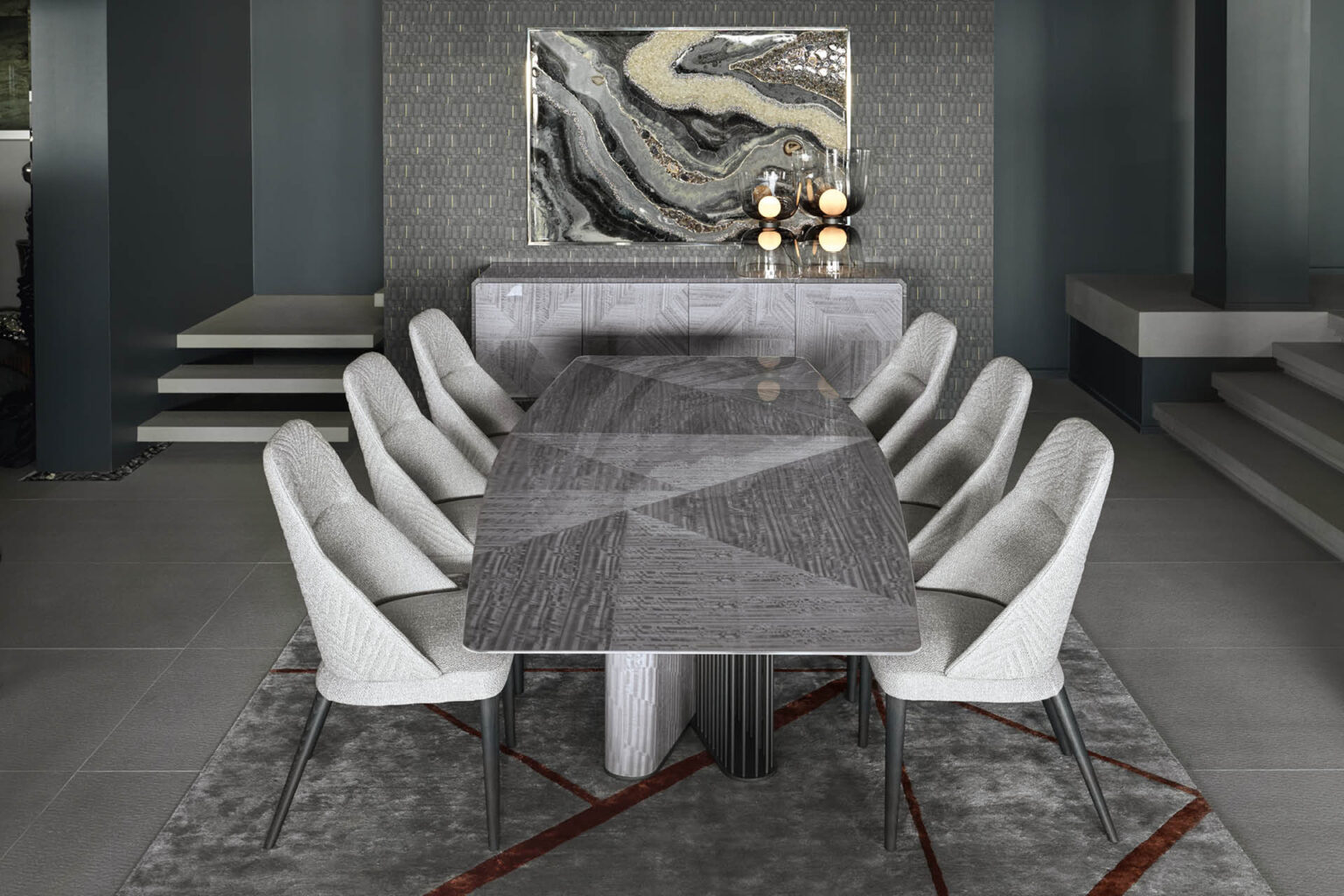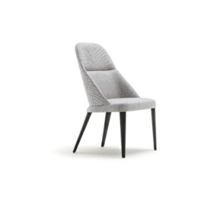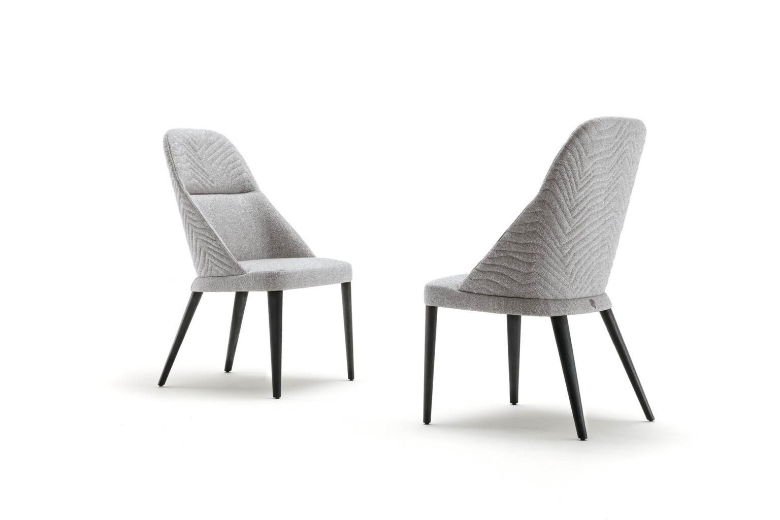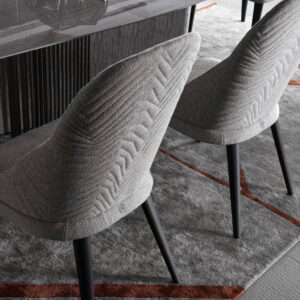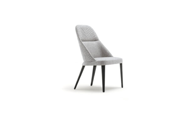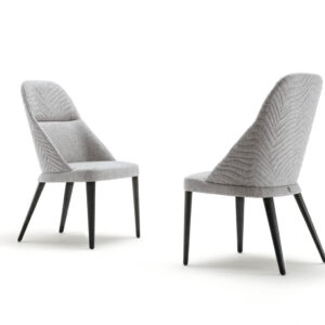 Fully upholstered side chair in solid oak. Back in quilted first grade leather, nubuk leather, lizard printed leather, velvet or suede fabric. Upholstered base with embroidered Giorgio Collection logo. 4 legs in satin open grain oak