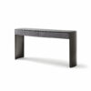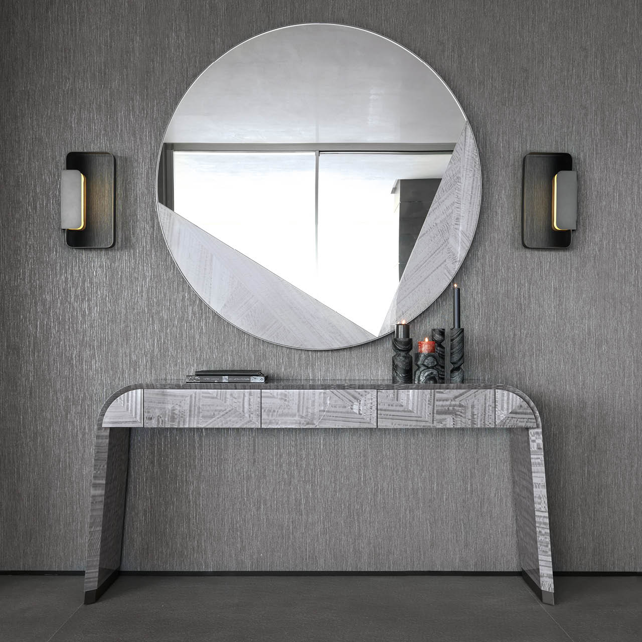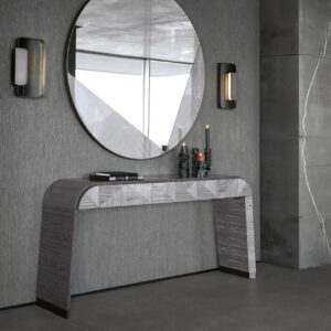 Curved consolle in inlaid Tasmanian curly Eucaliptus veneer with high gloss polyester finish. Curved legs with details in satin grey nickel stainless steel. 3 external full extension drawers with bottom part in velvet fabric.
