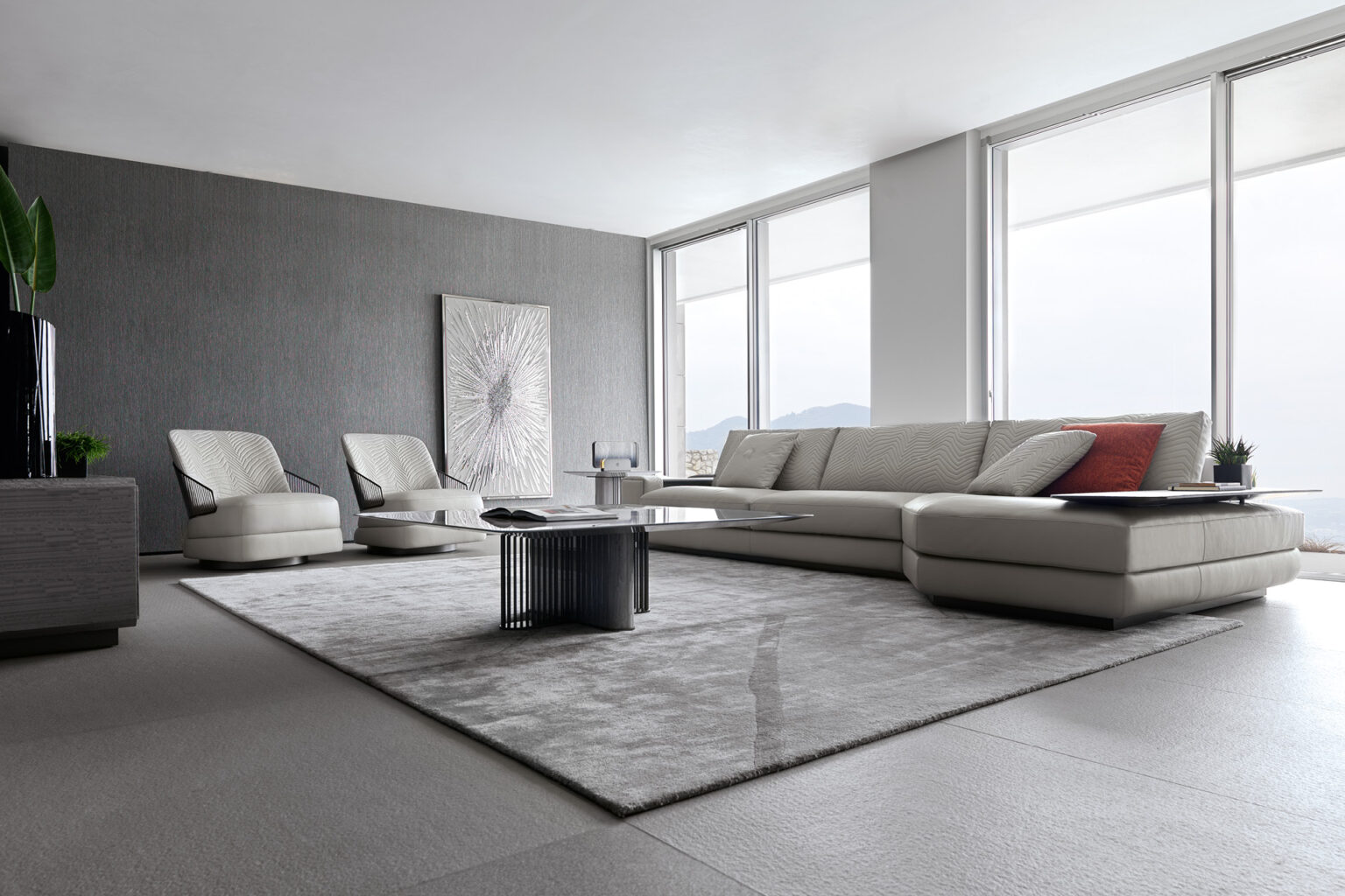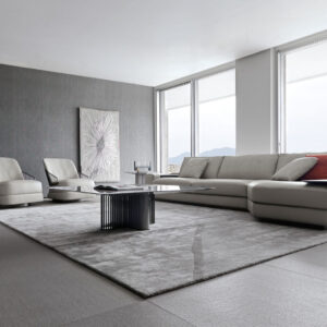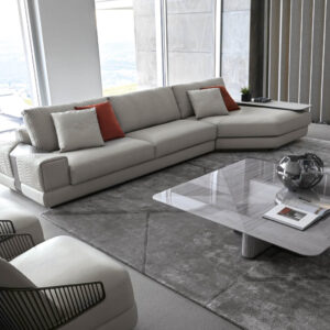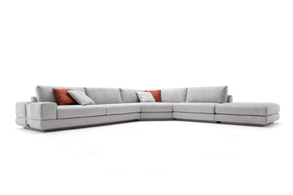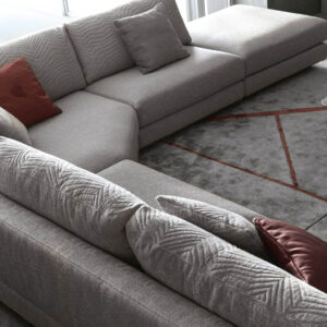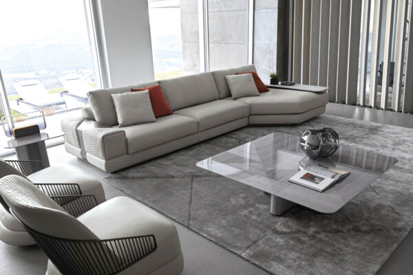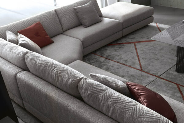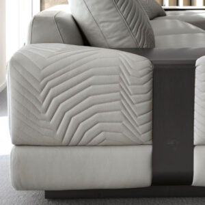 Moonlight modular sofa available in first grade leather, nubuk leather, lizard printed leather, velvet or suede fabric. Sofa seats and sides with special stitching in polyurethane foam wrapped in down feather. Quilted back and armrest. Metal band in the armrest with lasered Giorgio Collection logo. Base and band in satin grey nickel stainless steel.