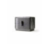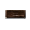 Night table in inlaid Tasmanian curly Eucaliptus veneer with high gloss polyester finish. 2 full extension drawers with bottom part in velvet fabric. Base and handles in satin grey nickel stainless steel. Top and sides with insert in satin grey nickel stainless steel.