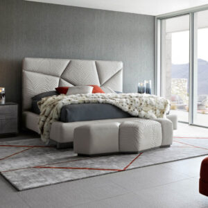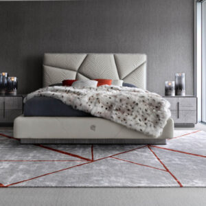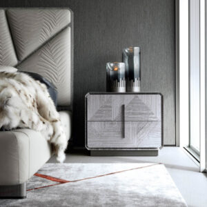 Night table in inlaid Tasmanian curly Eucaliptus veneer with high gloss polyester finish. 2 full extension drawers with bottom part in velvet fabric. Base and handles in satin grey nickel stainless steel. Top and sides with insert in satin grey nickel stainless steel.