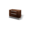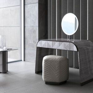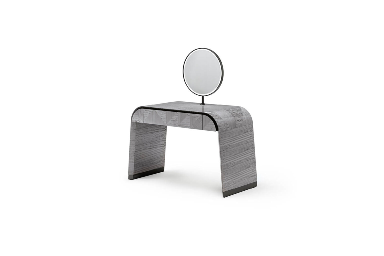 Curved vanity desk in inlaid Tasmanian curly Eucaliptus veneer with high gloss polyester finish. Curved legs with details in satin grey nickel stainless steel. 1 external full extension drawers with bottom part in velvet fabric.