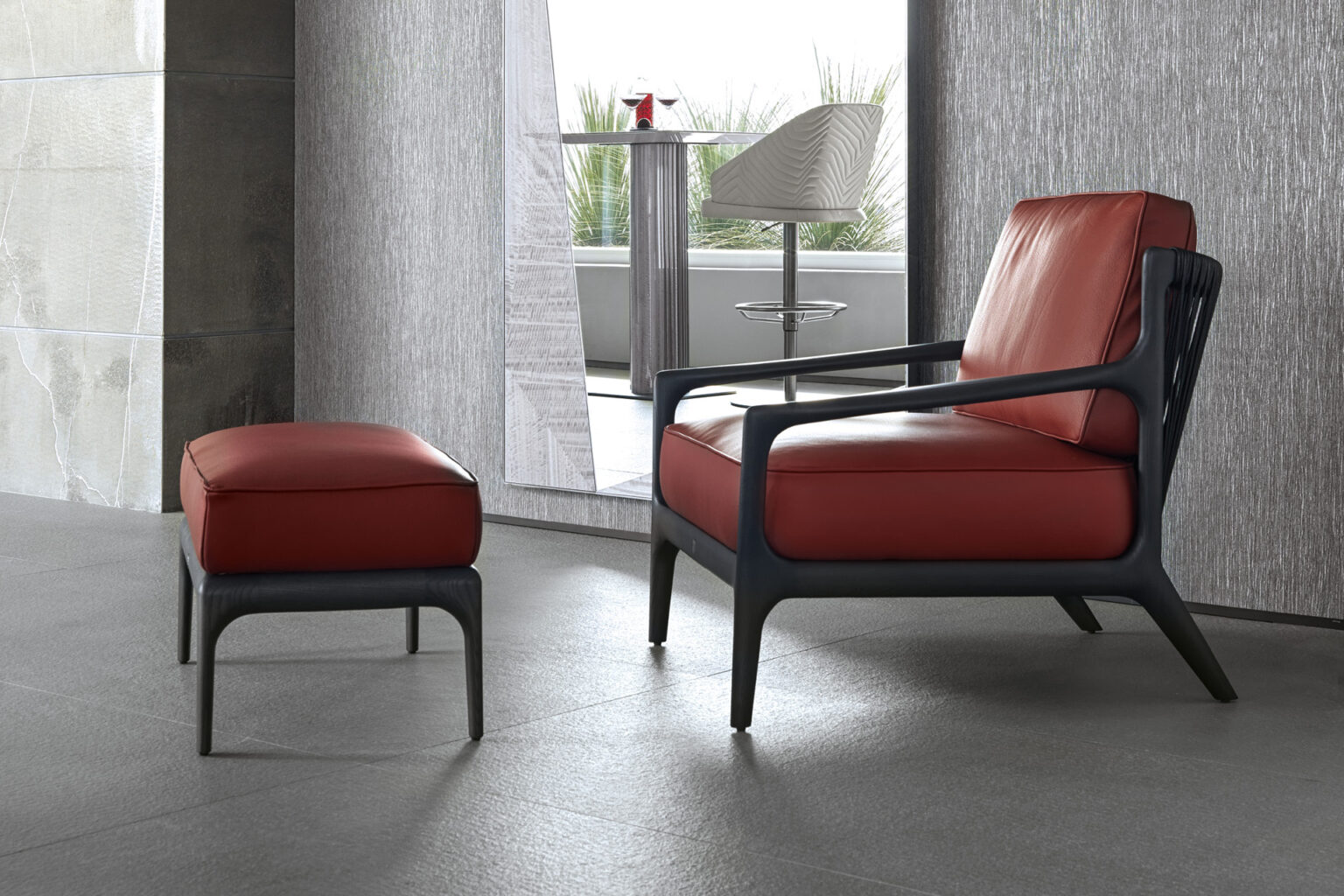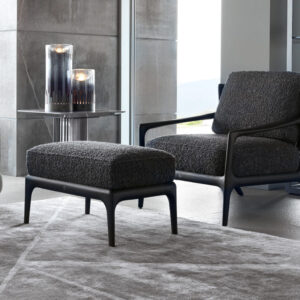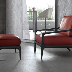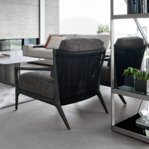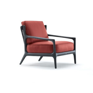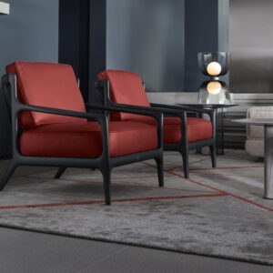 Occasional chair available in first grade leather, nubuk leather, lizard printed leather, velvet or suede fabric. Chair seat and sides with double stitching in polyurethane foam wrapped in down feather. Structure in solid satined black oak. Back in black cordage leather. Wooden base with inserted Giorgio Collection logo.