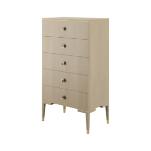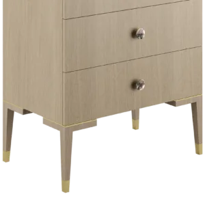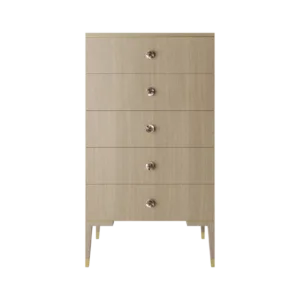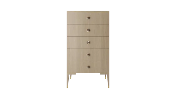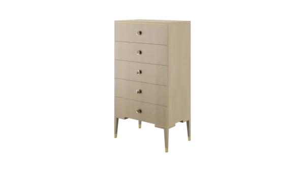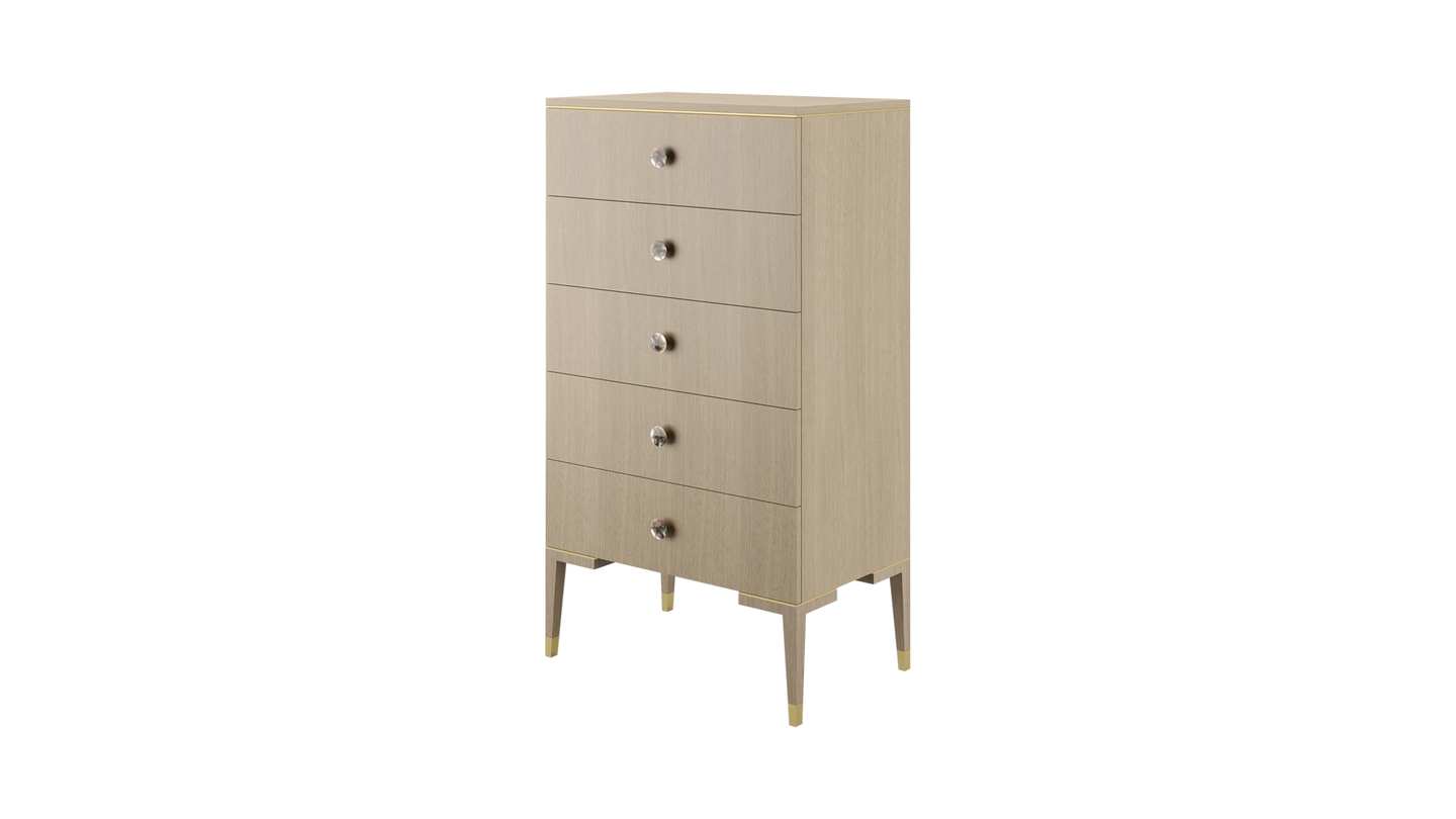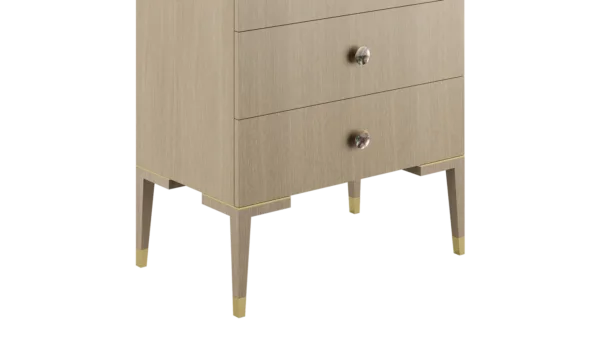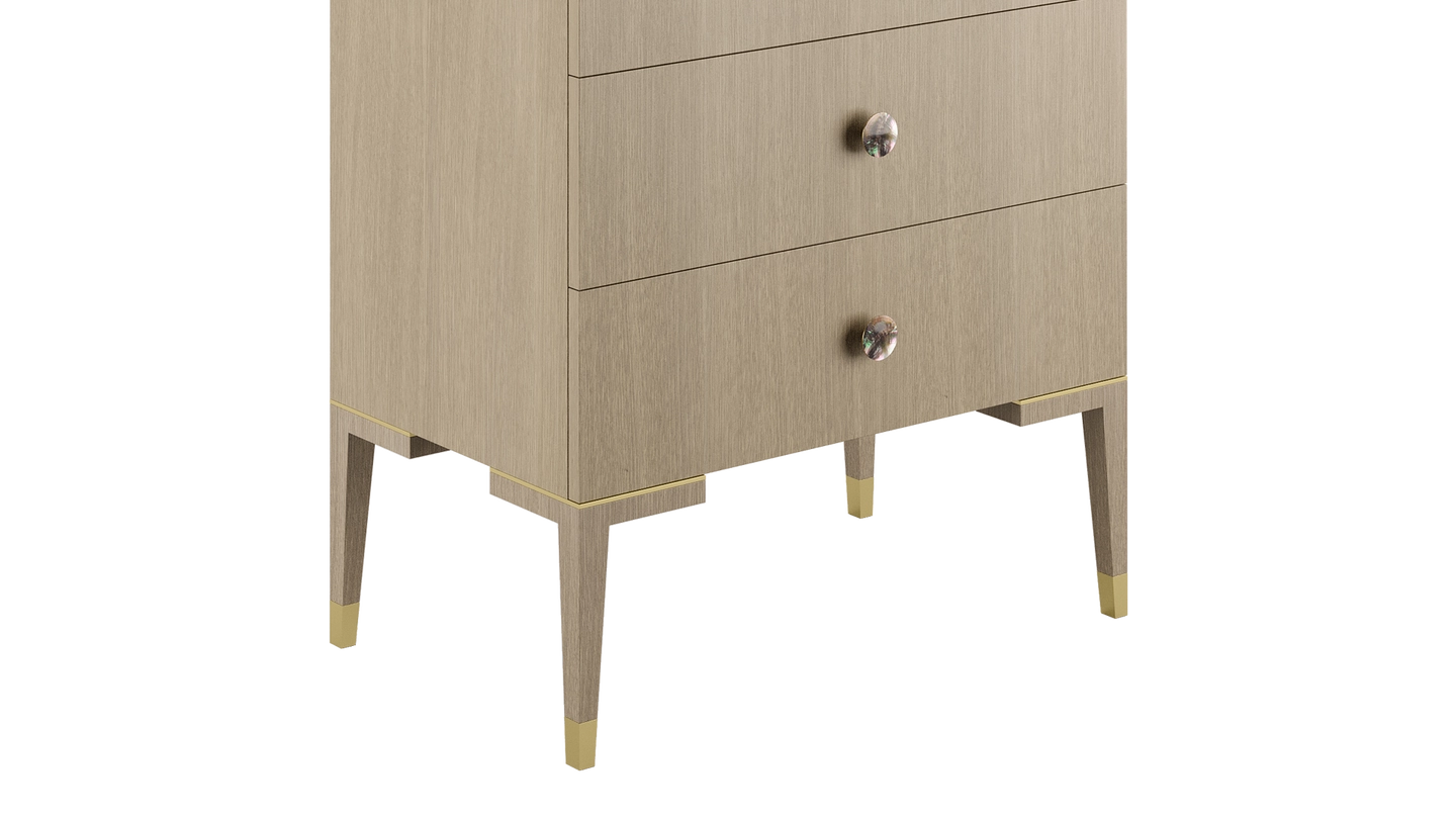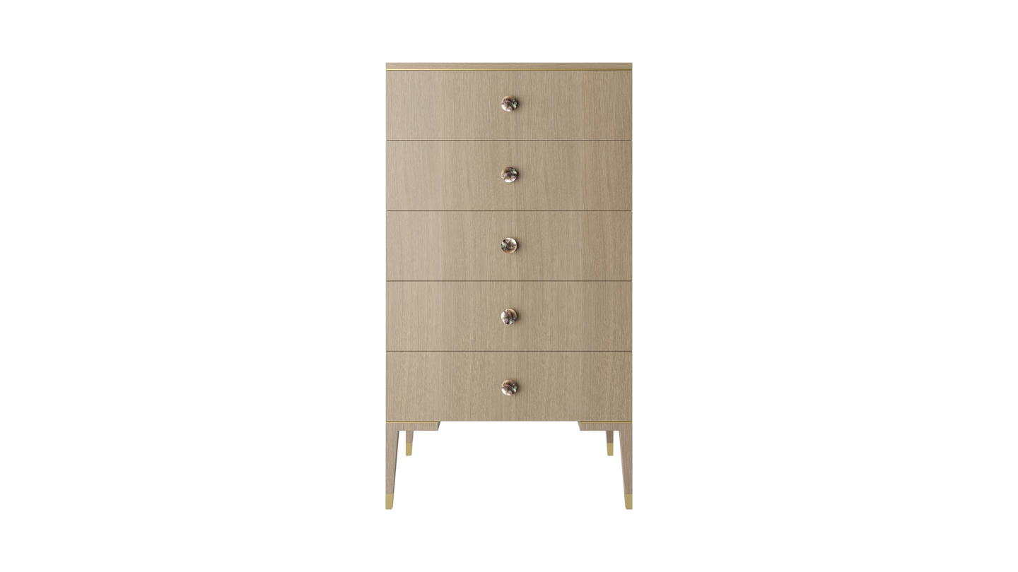 The clean lines of the wood veneer MOONSTONE tallboy are elevated through the application of brushed-brass details that emphasise its subtle Art Deco silhouette, while circular handles finished with black mother-of-pearl provide a final flourish.
