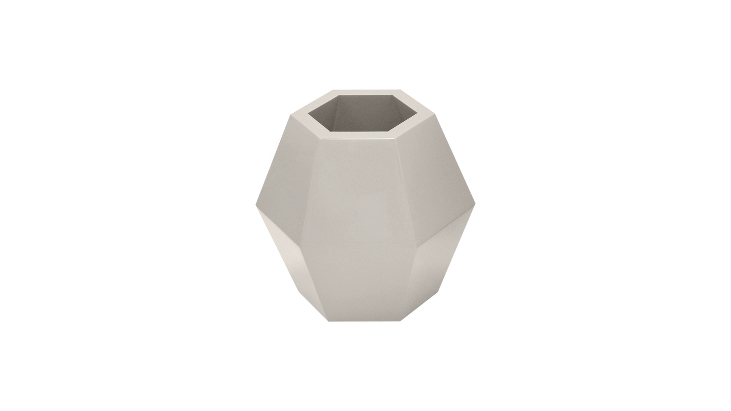 The hexagon-shaped MOSSY vase is seamlessly crafted from glossy lacquered wood and introduces a geometric vibe to the organic nature of flowers.