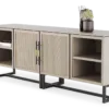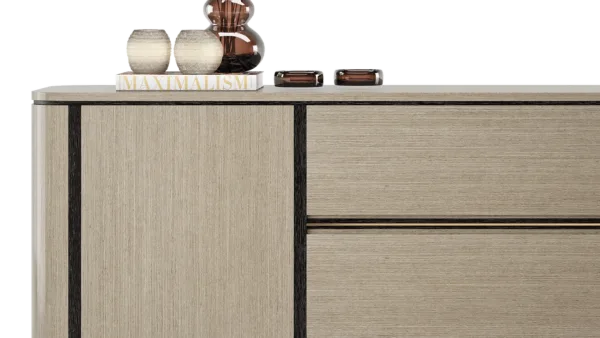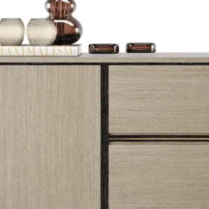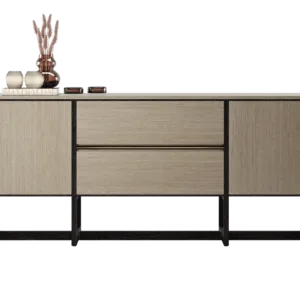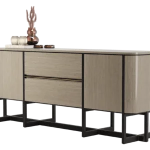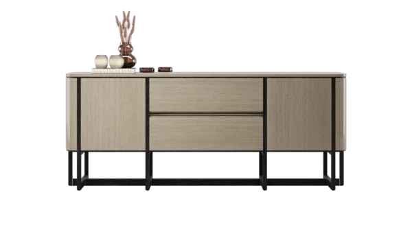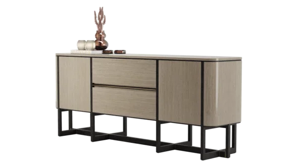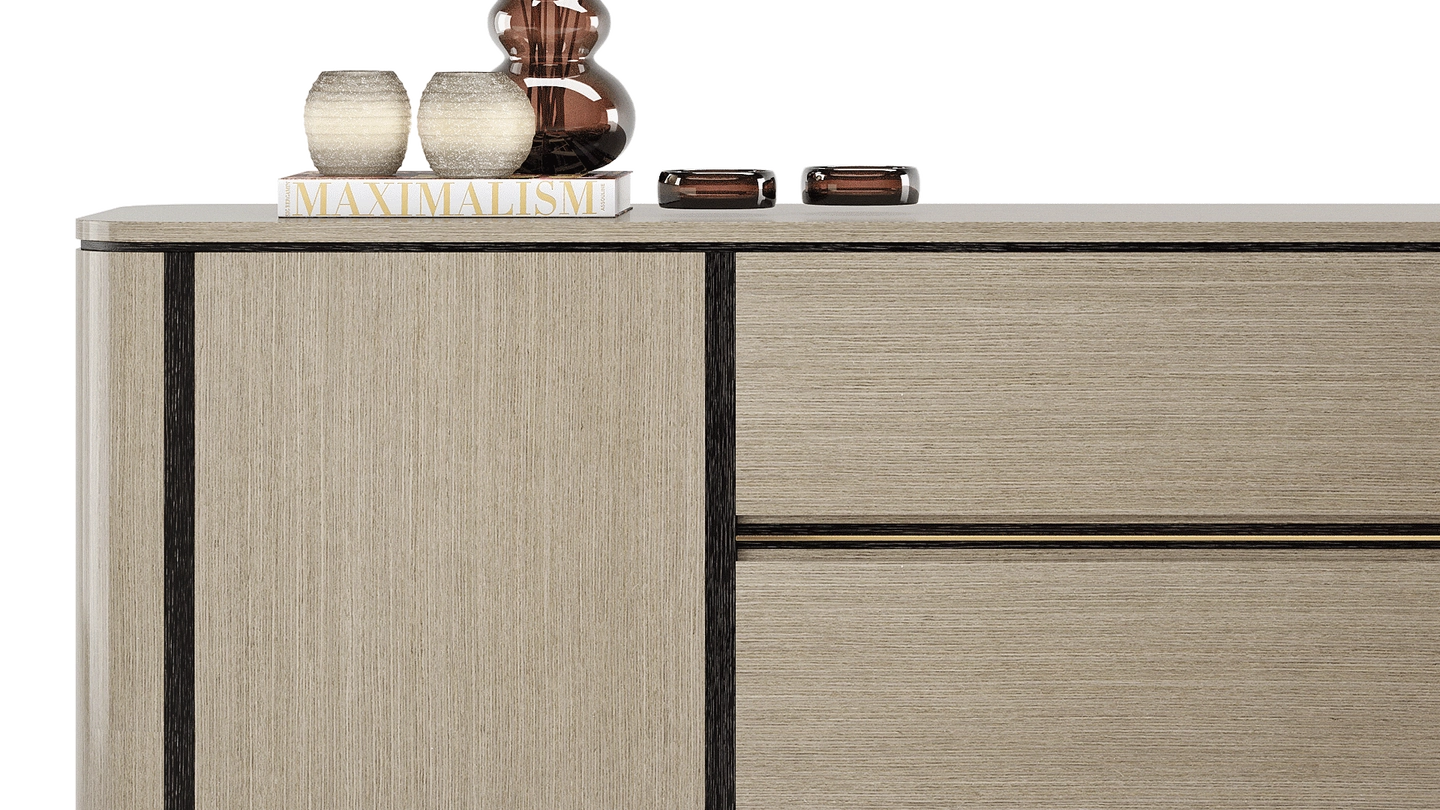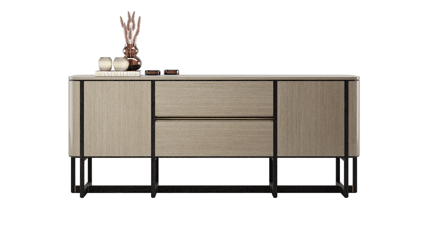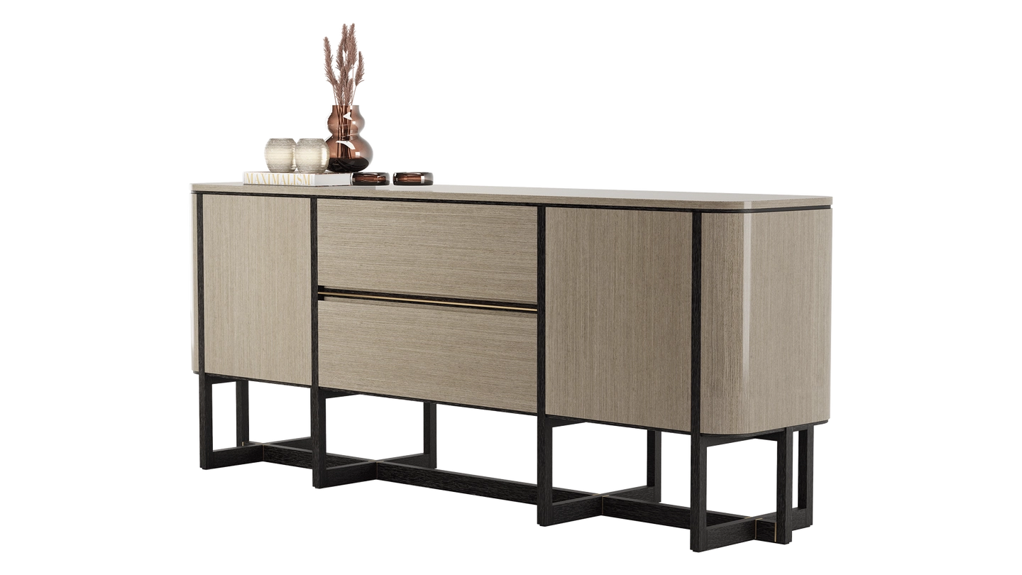 A refined combination of veneer, solid wood and brushed brass, the two-drawer/two-door MUMBAI sideboard’s curved silhouette feels warm and welcoming, while a striking architectural base provides a confident finish.