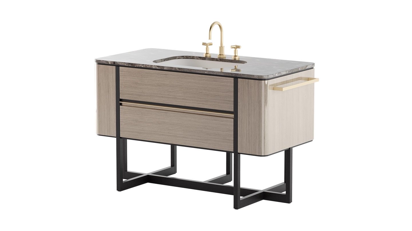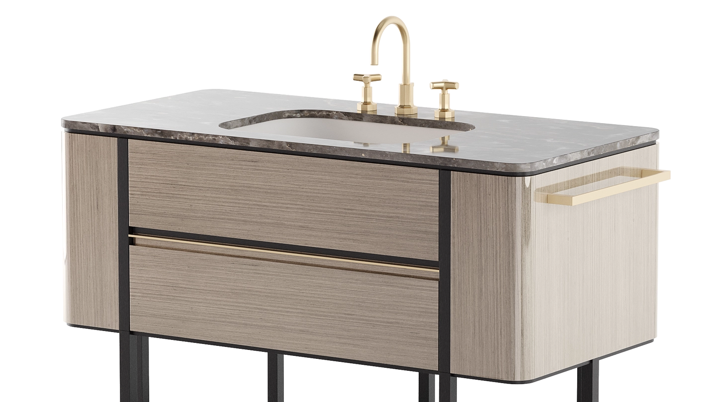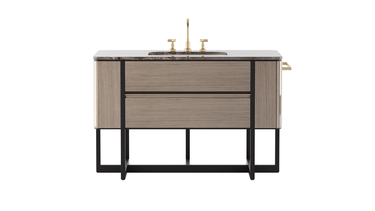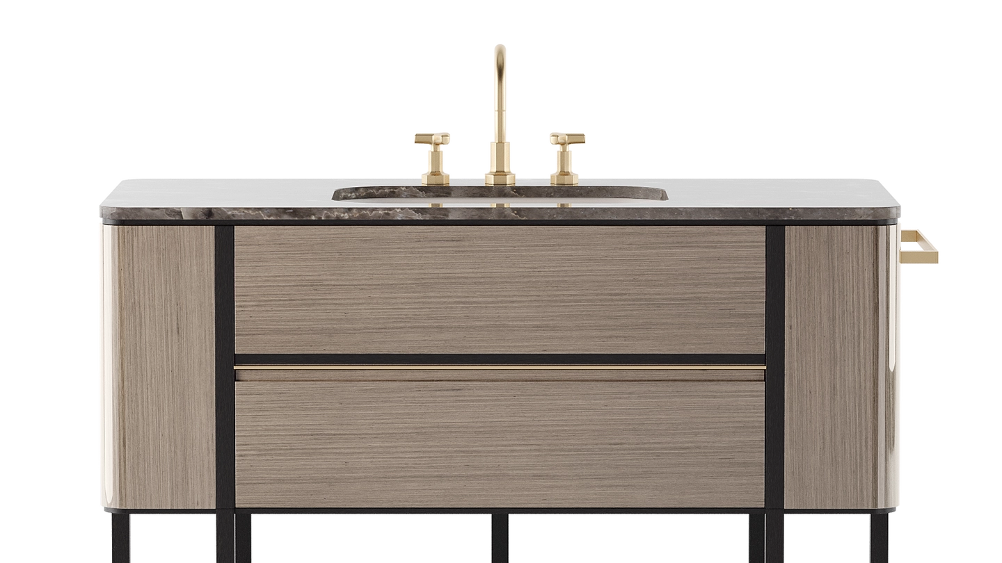 A refined combination of stone, veneer, solid wood and brushed brass, the two-drawer MUMBAI vanity unit feels warm and welcoming, while a striking architectural base provides a confident finish.