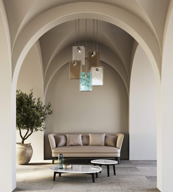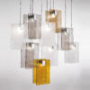 Pendant in cast glass with metal details in chrome finish. Available in different colours.