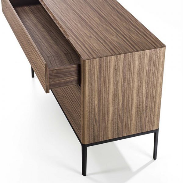 The Nara comes in a choice of solid canaletto walnut finish with a sleek matt black metal base and raised feet.
