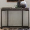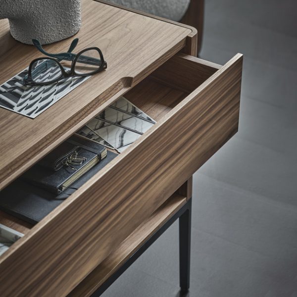 The Nara Console Table by Porada is an elegant modern design in solid canaletto walnut wood with gently rounded corners, featuring a drawer and an open shelf compartment supported by a slender frame in matt black metal.