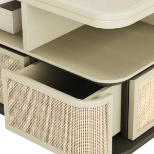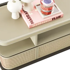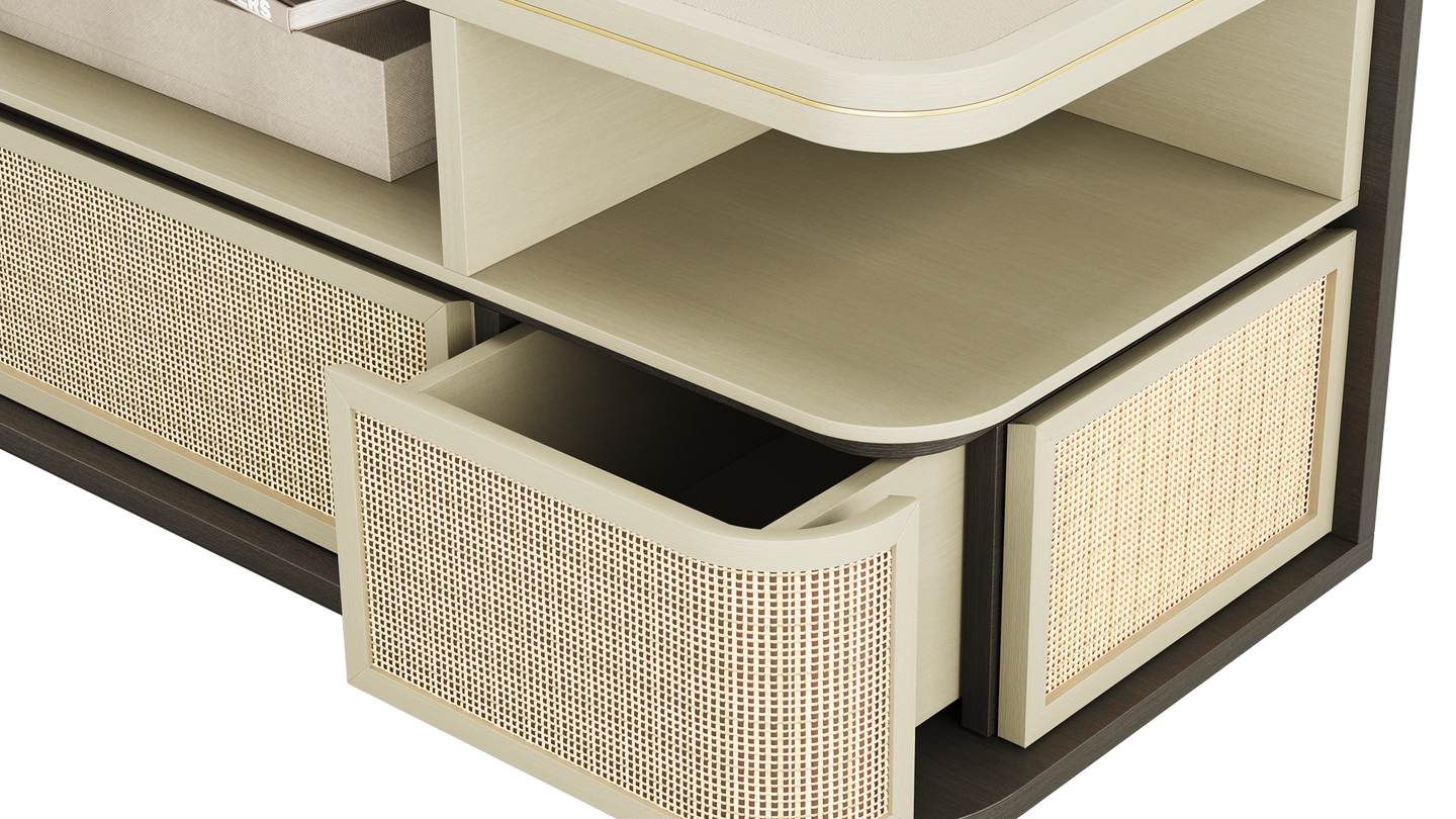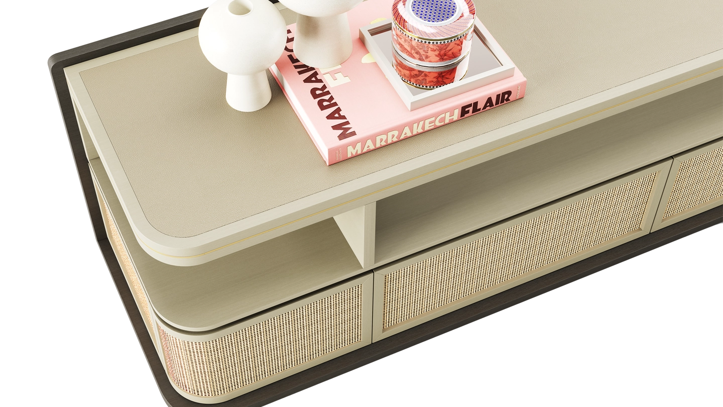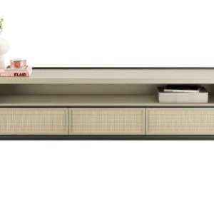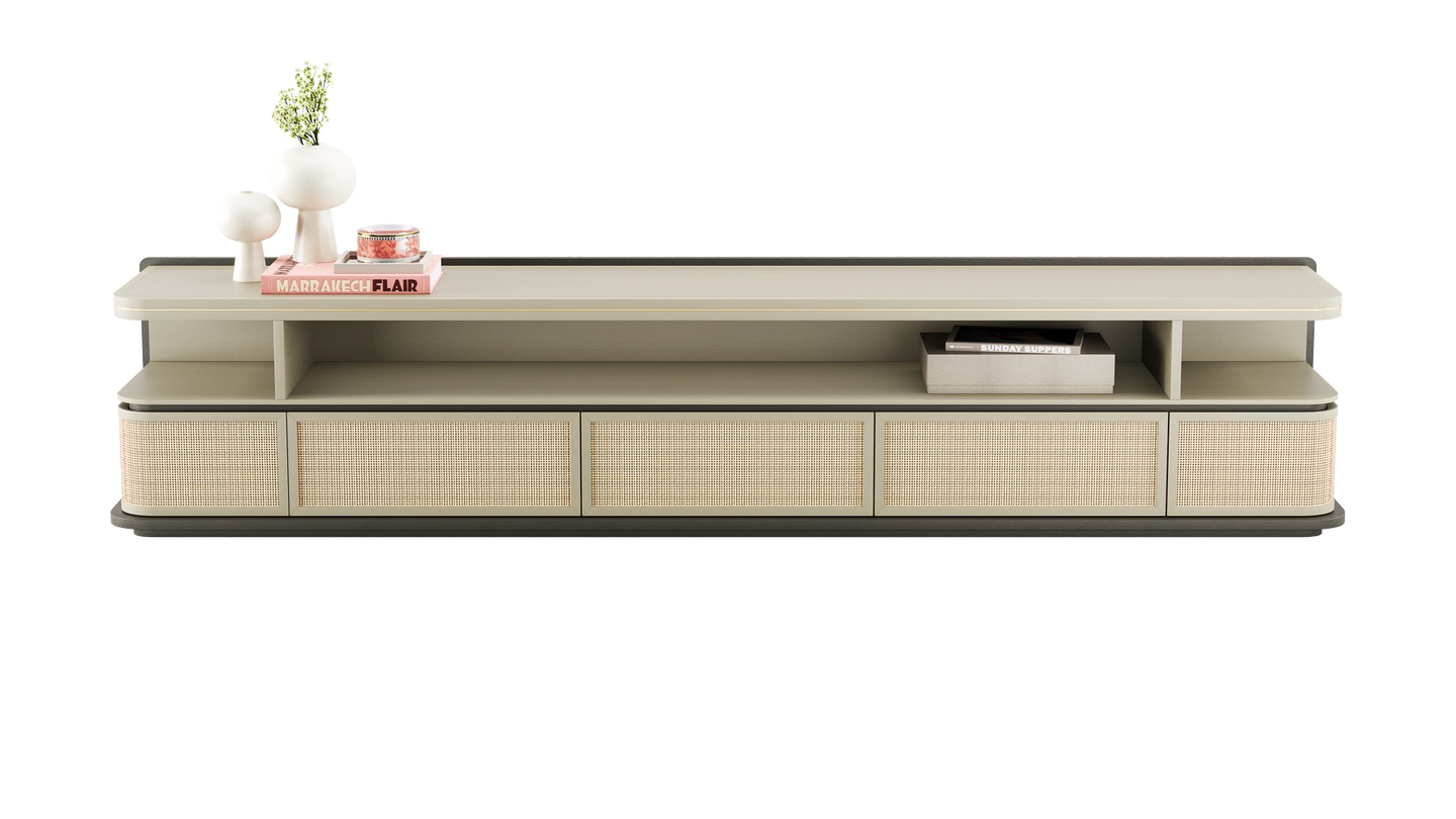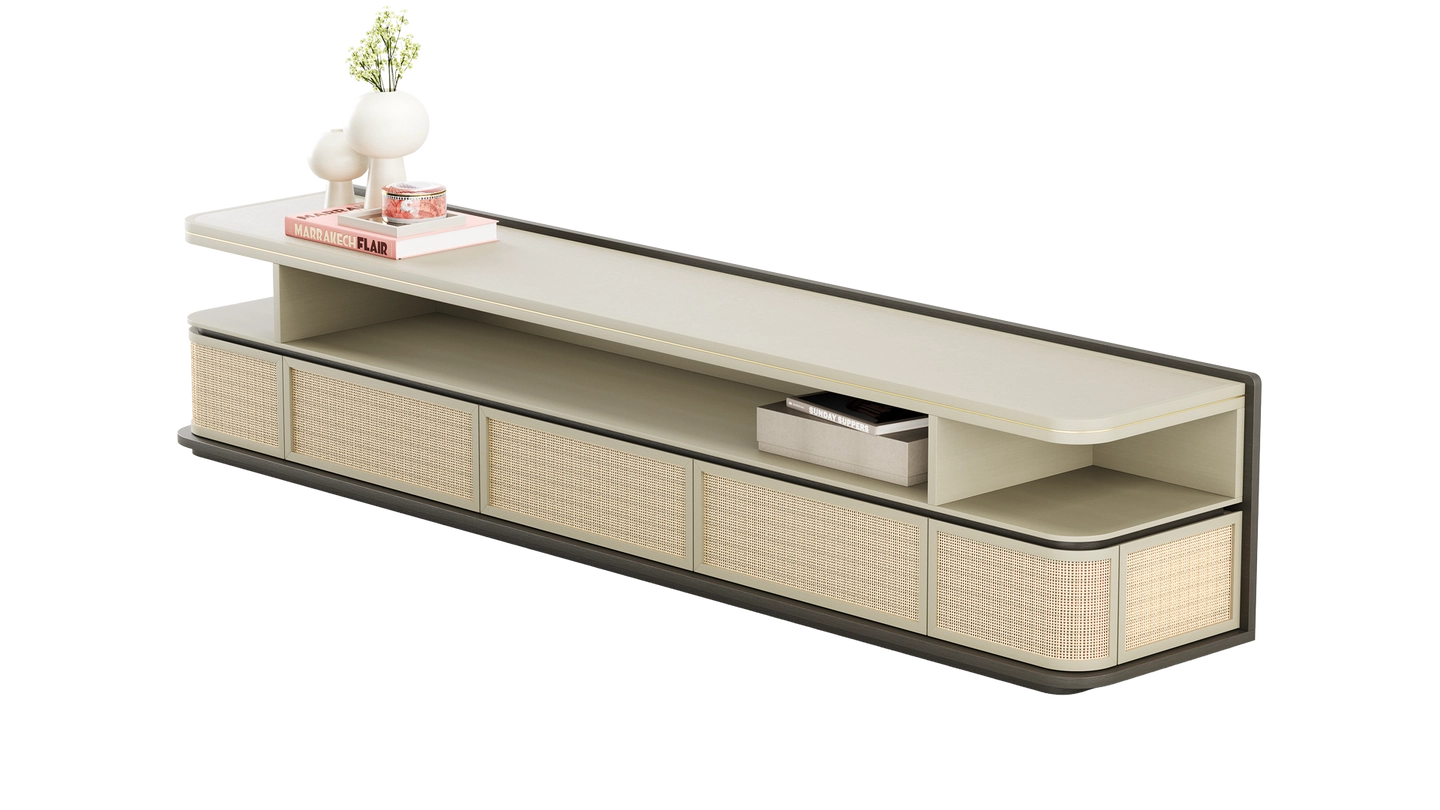 “The NAVALA TV Unit combines satin open pore wood with rattan inlays to bring a natural touch to your lounge. It combines shelves and drawer space to be as practical as it is beautiful. ”