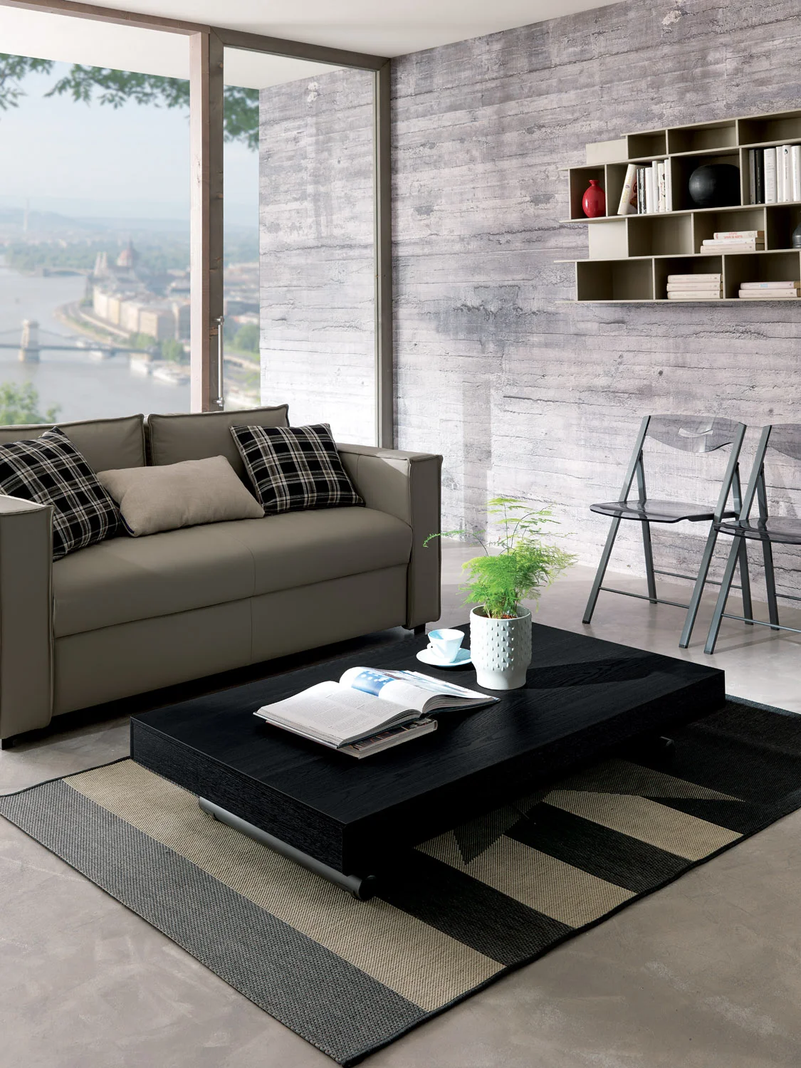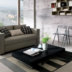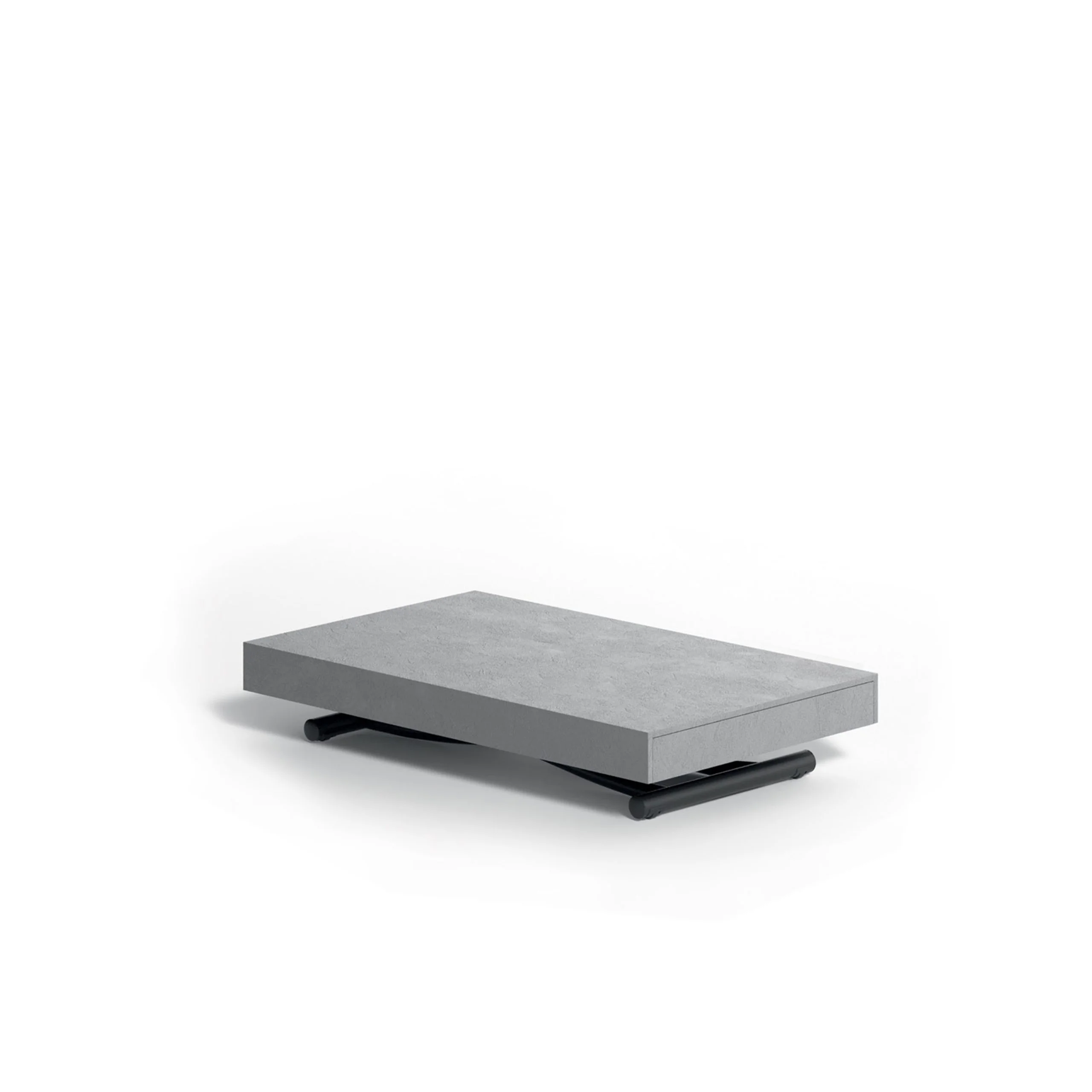 Metal frame transformable table, gas adjustable height from cm 23 to cm 80, synchronised telescopic extension mechanism.
